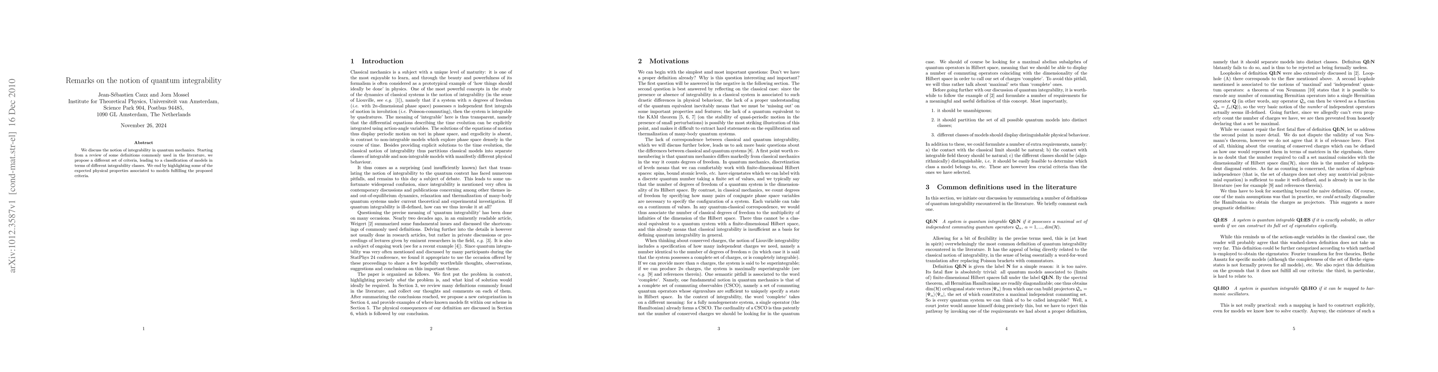 We discuss the notion of integrability in quantum mechanics. Starting from a review of some definitions commonly used in the literature, we propose a different set of criteria, leading to a classification of models in terms of different integrability classes. We end by highlighting some of the expected physical properties associated to models fulfilling the proposed criteria.