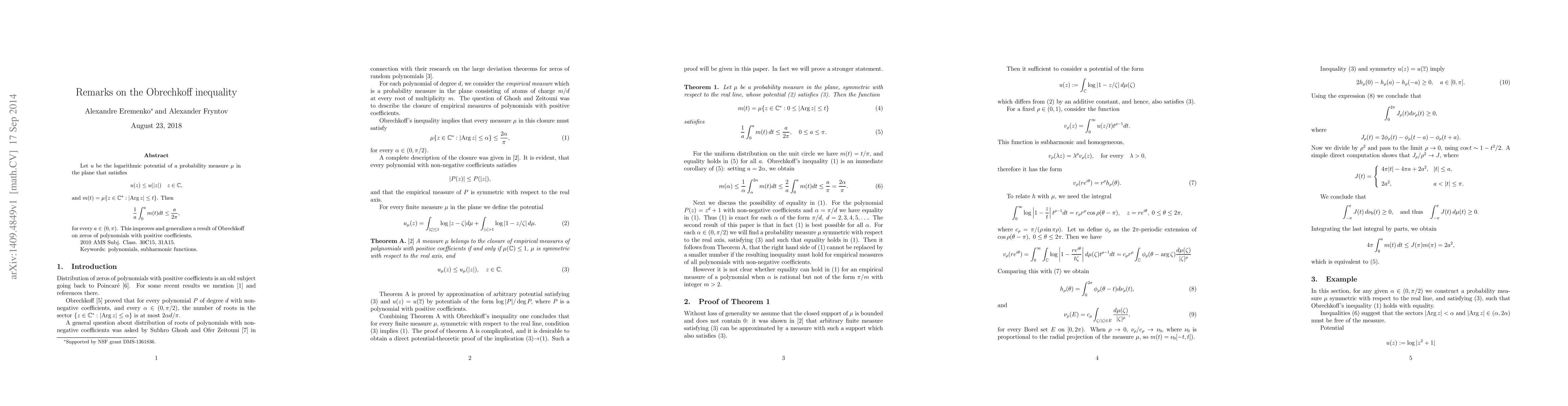 This paper improves and generalizes Oberchkoff's inequality, which states that a polynomial of degree d with non-negative coefficients has at most 2ad/π zeros in the angle |arg z|<a, and investigates the conditions under which equality holds.
