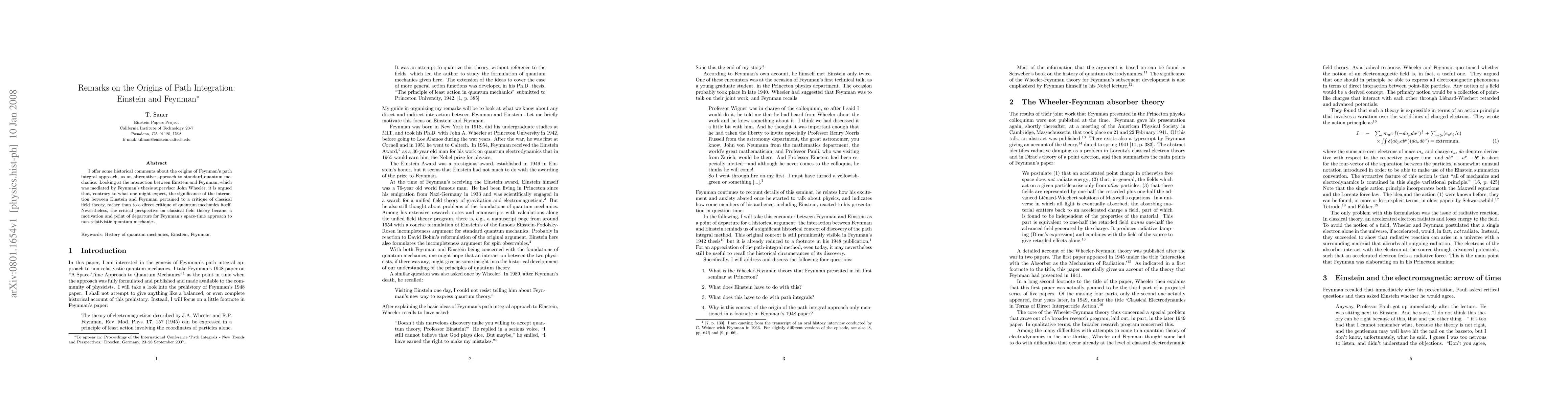 This paper explores the historical context of Feynman's path integral approach to quantum mechanics, tracing its roots back to Einstein's critique of classical field theory through his interactions with John Wheeler.