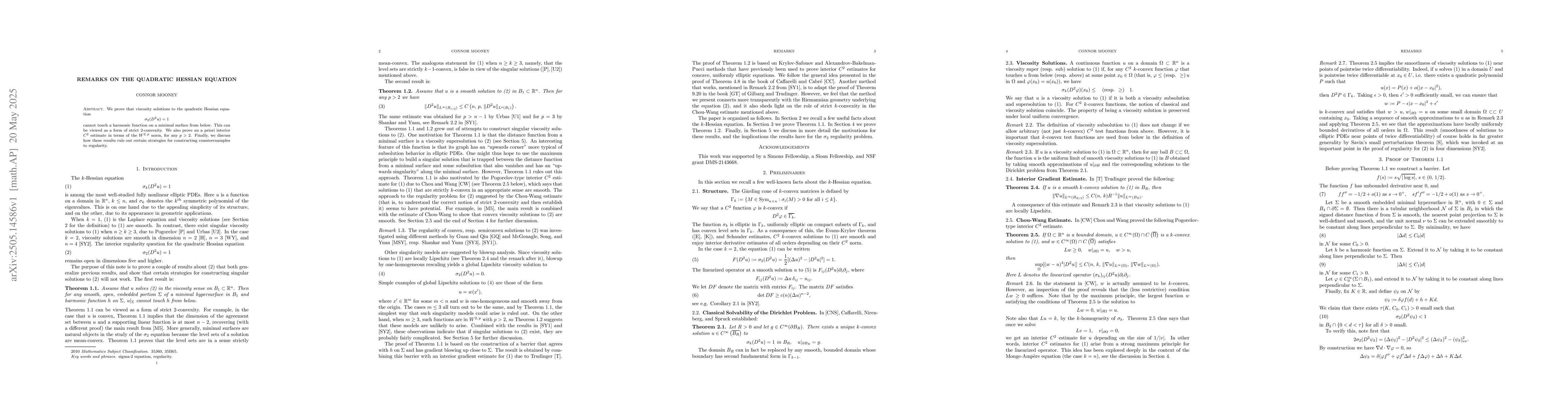 This paper proves that solutions to a specific quadratic Hessian equation cannot touch harmonic functions on minimal surfaces from below, indicating a form of strict convexity. It also establishes interior regularity estimates and discusses implications for potential counterexamples to solution smoothness.