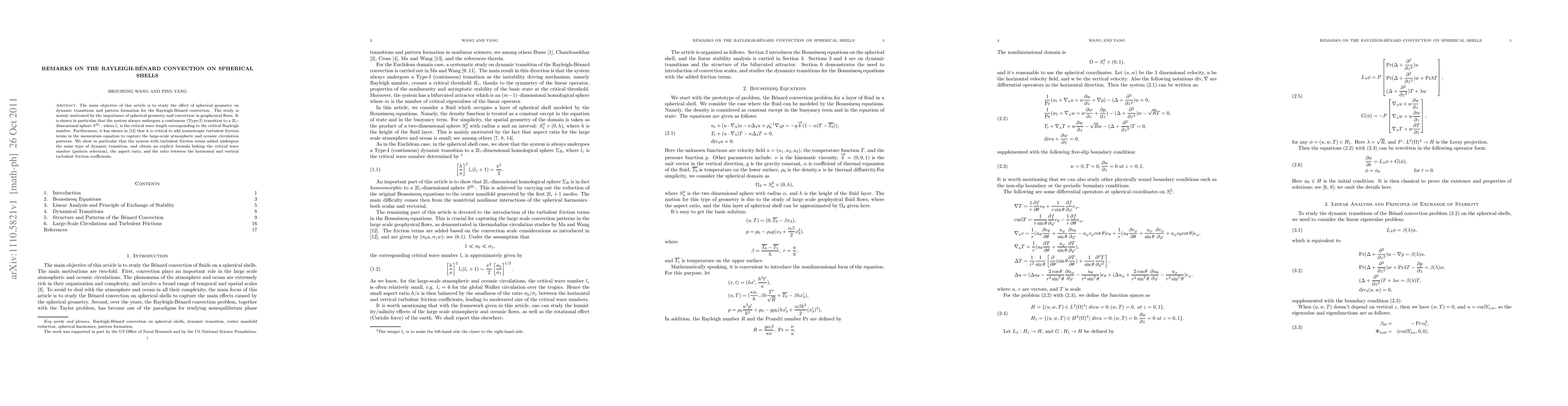 The main objective of this article is to study the effect of spherical geometry on dynamic transitions and pattern formation for the Rayleigh-Benard convection. The study is mainly motivated by the importance of spherical geometry and convection in geophysical flows. It is shown in particular that the system always undergoes a continuous (Type-I) transition to a $2l_c$-dimensional sphere $S^{2lc}$, where lc is the critical wave length corresponding to the critical Rayleigh number. Furthermore, it has shown in [12] that it is critical to add nonisotropic turbulent friction terms in the momentum equation to capture the large-scale atmospheric and oceanic circulation patterns. We show in particular that the system with turbulent friction terms added undergoes the same type of dynamic transition, and obtain an explicit formula linking the critical wave number (pattern selection), the aspect ratio, and the ratio between the horizontal and vertical turbulent friction coefficients.
