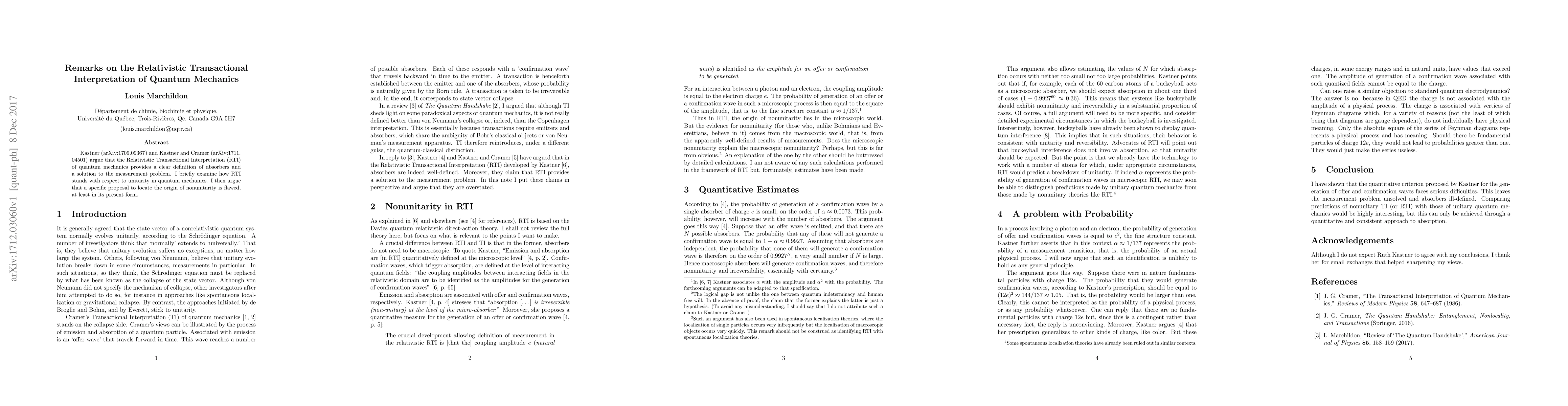 Kastner (arXiv:1709.09367) and Kastner and Cramer (arXiv:1711.04501) argue that the Relativistic Transactional Interpretation (RTI) of quantum mechanics provides a clear definition of absorbers and a solution to the measurement problem. I briefly examine how RTI stands with respect to unitarity in quantum mechanics. I then argue that a specific proposal to locate the origin of nonunitarity is flawed, at least in its present form.
