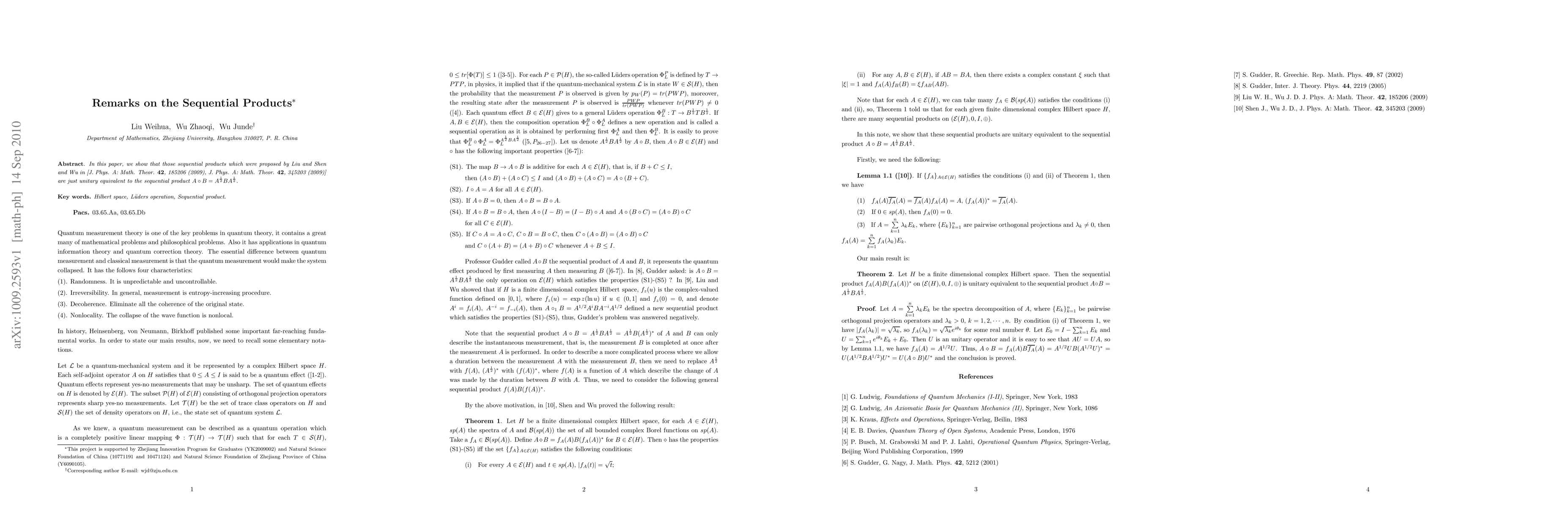 In this paper, we show that those sequential products which were proposed by Liu and Shen and Wu in [J. Phys. A: Math. Theor. {\bf 42}, 185206 (2009), J. Phys. A: Math. Theor. {\bf 42}, 345203 (2009)] are just unitary equivalent to the sequential product $A\circ B=A^{\frac{1}{2}}BA^{\frac{1}{2}}$.