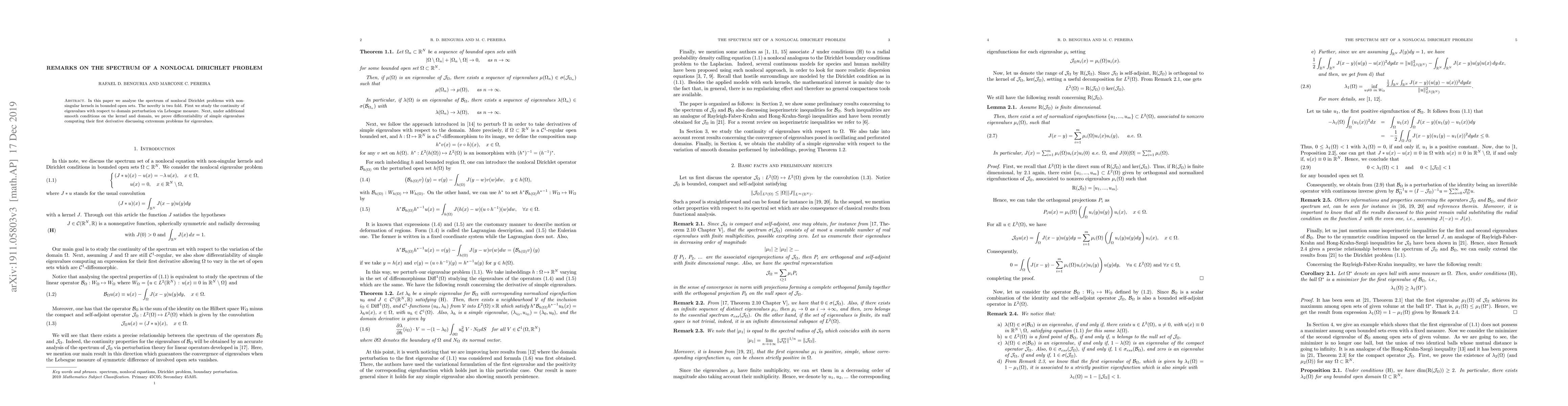 This paper analyzes the spectrum of nonlocal Dirichlet problems with non-singular kernels in bounded open sets, showing that eigenvalues are continuous and differentiable under certain conditions.