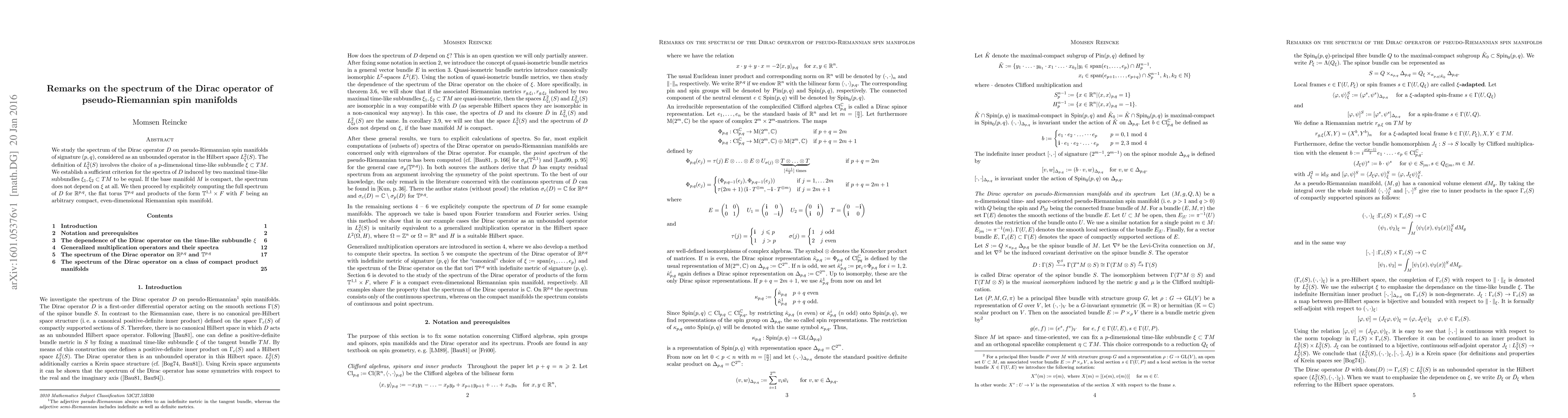 We study the spectrum of the Dirac operator $D$ on pseudo-Riemannian spin manifolds of signature $(p,q)$, considered as an unbounded operator in the Hilbert space $L^2_\xi(S)$. The definition of $L^2_\xi(S)$ involves the choice of a $p$-dimensional time-like subbundle $\xi\subset TM$. We establish a sufficient criterion for the spectra of $D$ induced by two maximal time-like subbundles $\xi_1,\xi_2\subset TM$ to be equal. If the base manifold $M$ is compact, the spectrum does not depend on $\xi$ at all. We then proceed by explicitely computing the full spectrum of $D$ for $\mathbb R^{p,q}$, the flat torus $\mathbb T^{p,q}$ and products of the form $\mathbb T^{1,1}\times F$ with $F$ being an arbitrary compact, even-dimensional Riemannian spin manifold.