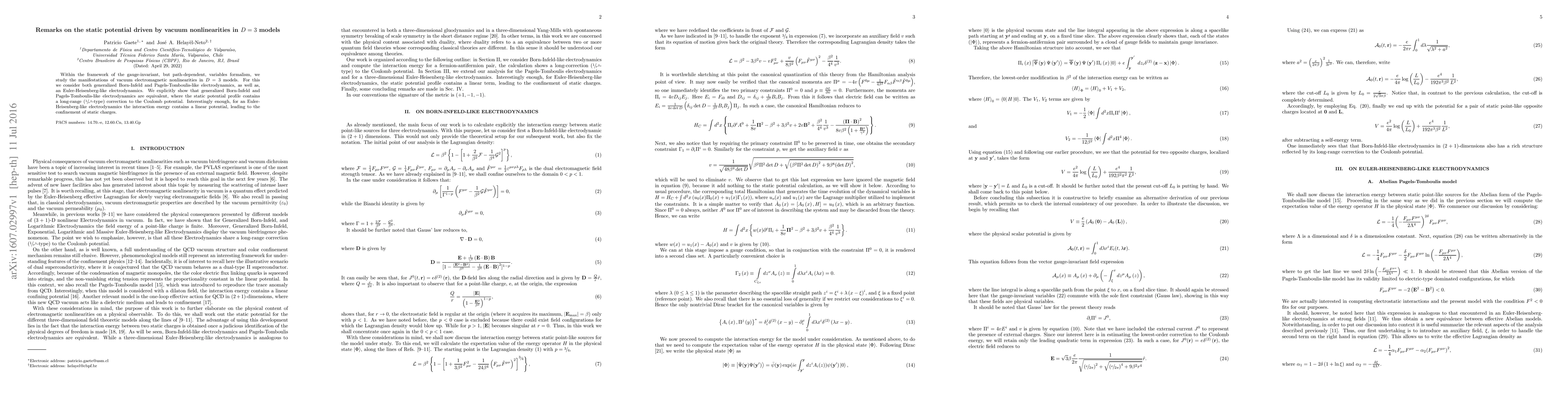 This paper explores vacuum electromagnetic nonlinearities in $D=3$ models using gauge-invariant formalism, showing equivalence between generalized Born-Infeld and Pagels-Tomboulis-like electrodynamics with long-range corrections to the Coulomb potential. In contrast, Euler-Heisenberg-like electrodynamics results in a linear potential, suggesting charge confinement.