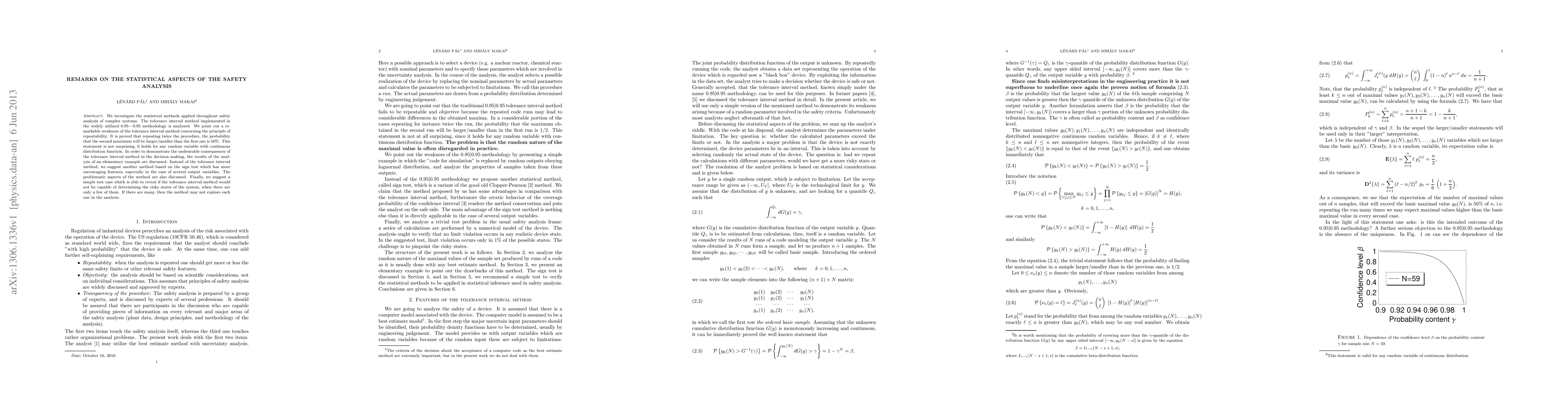 We investigate the statistical methods applied throughout safety analysis of complex systems. The tolerance interval method implemented in the widely utilized 0.95|0.95 methodology is analyzed. We point out a remarkable weakness of the tolerance interval method concerning the principle of repeatability. It is proved that repeating twice the procedure, the probability that the second maximum will be larger/smaller than the first one is 50\%. This statement is not surprising, it holds for any random variable with continuous distribution function. In order to demonstrate the undesirable consequences of the tolerance interval method in the decision making, the results of the analysis of an elementary example are discussed. Instead of the tolerance interval method, we suggest another method based on the sign test which has more encouraging features, especially in the case of several output variables. The problematic aspects of the method are also discussed. Finally, we suggest a simple test case which is able to reveal if the tolerance interval method would not be capable of determining the risky states of the system, when there are only a few of them. If there are many, then the method may not explore each one in the analysis.