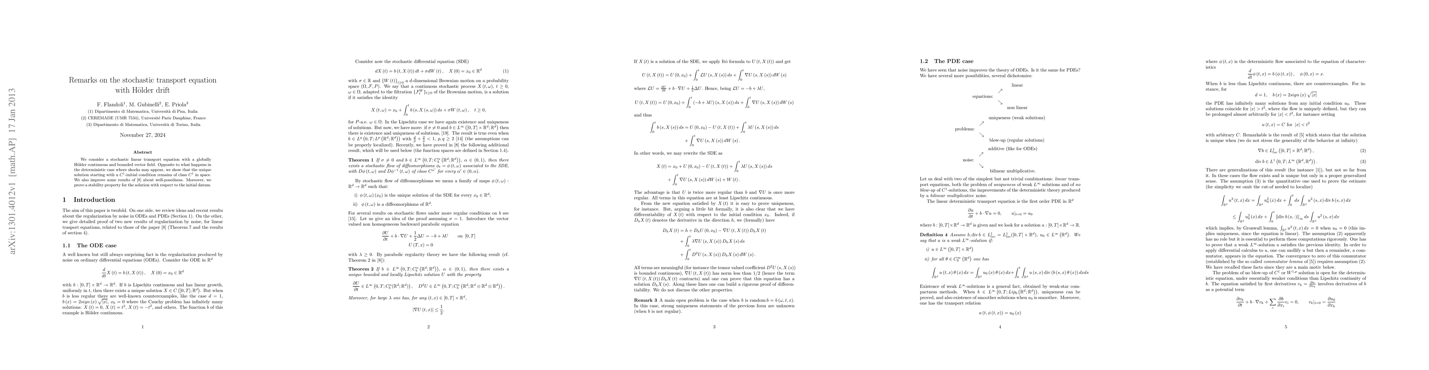 We consider a stochastic linear transport equation with a globally H\"{o}lder continuous and bounded vector field. Opposite to what happens in the deterministic case where shocks may appear, we show that the unique solution starting with a C^{1}-initial condition remains of class $C^{1}$ in space. We also improve some results of Flandoli-Gubinelli-Priola (2009) about well-posedness. Moreover, we prove a stability property for the solution with respect to the initial datum.