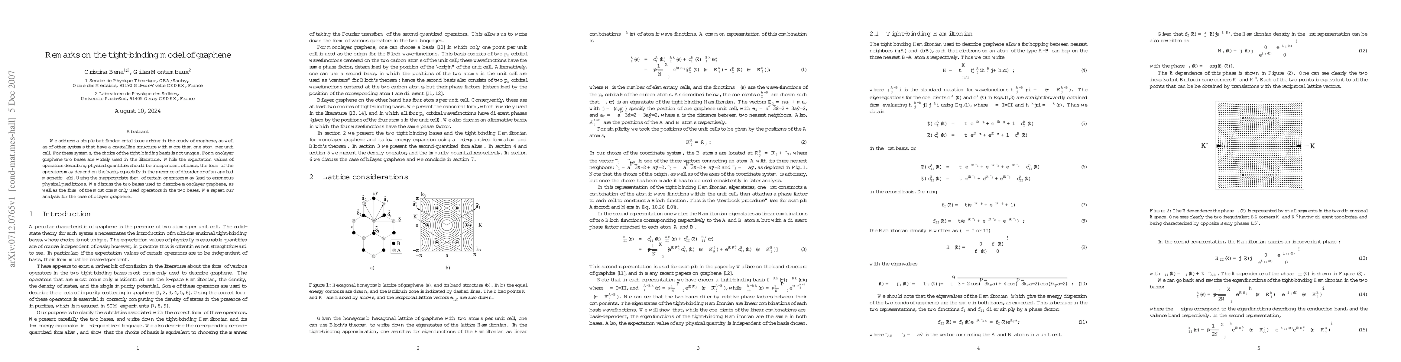 This paper discusses the non-uniqueness of tight-binding basis in graphene and other multi-atom-per-unit-cell crystalline structures. It highlights that the choice of operator form can affect physical predictions, especially with disorder or magnetic fields, and compares two common bases used for monolayer graphene, extending the analysis to bilayer graphene.