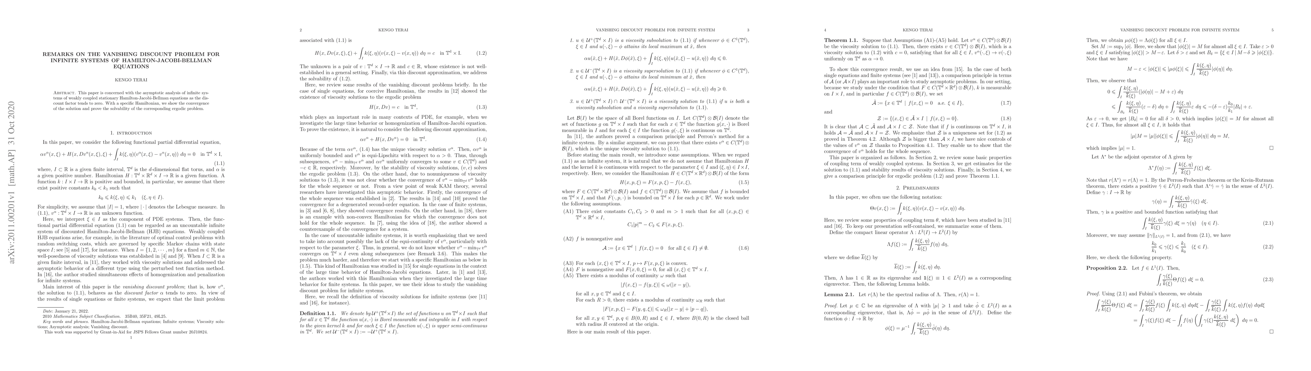 This paper analyzes the asymptotic behavior of infinite systems of weakly coupled Hamilton-Jacobi-Bellman equations as the discount factor approaches zero. It demonstrates the convergence of solutions and proves the solvability of the associated ergodic problem for a specific Hamiltonian.