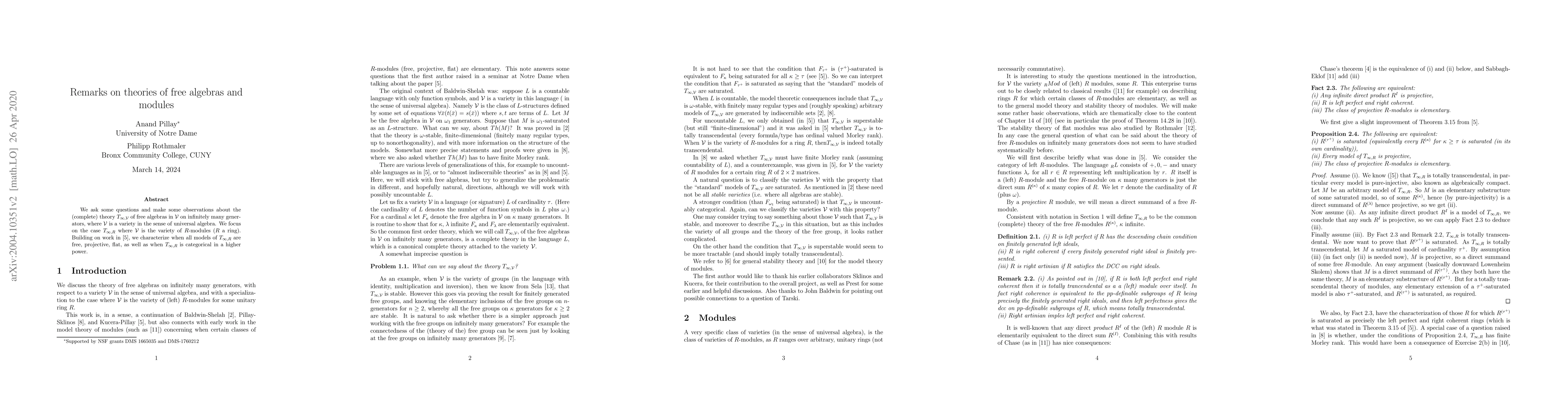 We ask some questions and make some observations about the (complete) theory T (infinity, V) of free algebras in V on infinitely many generators, where V is a variety in the sense of universal algebra. We focus on the case T(infinity, R) where V is the variety of R-modules (R a ring). Building on work in Kucera-Pillay we characterize when all models of T(infinity, R) are free, projective, flat, as well as when T(infinity,R) is categorical in a higher power.