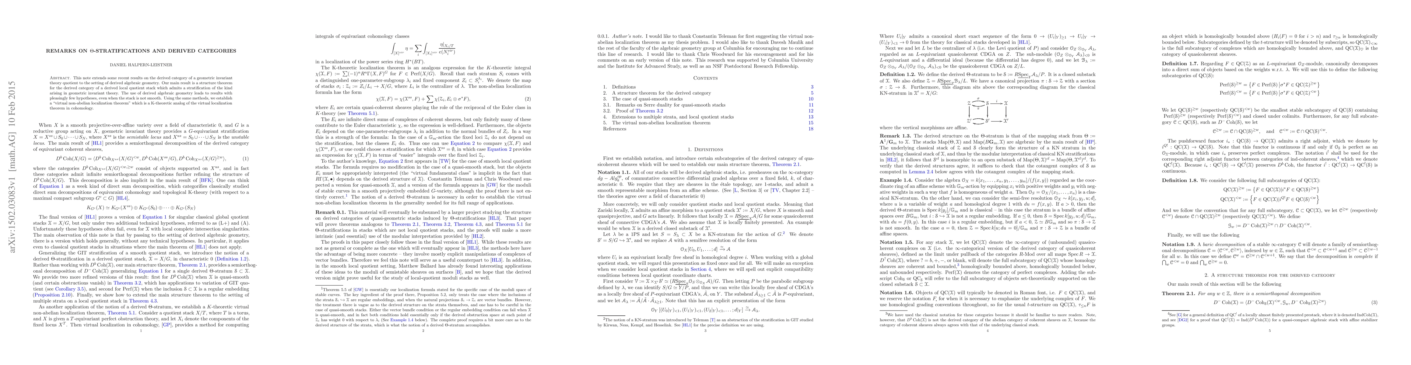 This note extends some recent results on the derived category of a geometric invariant theory quotient to the setting of derived algebraic geometry. Our main result is a structure theorem for the derived category of a derived local quotient stack which admits a stratification of the kind arising in geometric invariant theory. The use of derived algebraic geometry leads to results with pleasingly few hypotheses, even when the stack is not smooth. Using the same methods, we establish a "virtual non-abelian localization theorem" which is a K-theoretic analog of the virtual localization theorem in cohomology.