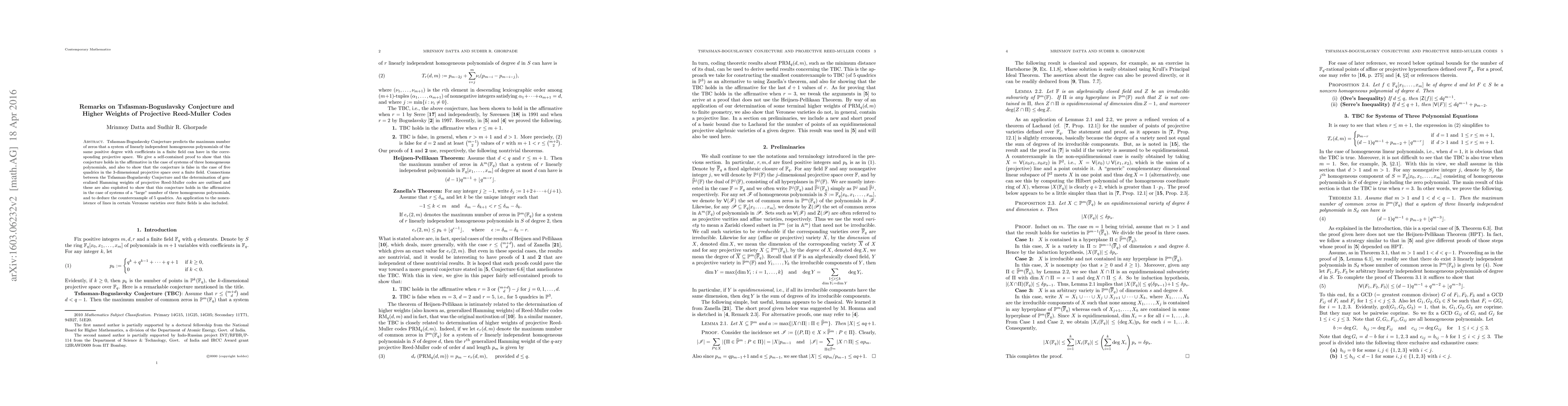 Tsfasman-Boguslavsky Conjecture predicts the maximum number of zeros that a system of linearly independent homogeneous polynomials of the same positive degree with coefficients in a finite field can have in the corresponding projective space. We give a self-contained proof to show that this conjecture holds in the affirmative in the case of systems of three homogeneous polynomials, and also to show that the conjecture is false in the case of five quadrics in the 3-dimensional projective space over a finite field. Connections between the Tsfasman-Boguslavsky Conjecture and the determination of generalized Hamming weights of projective Reed-Muller codes are outlined and these are also exploited to show that this conjecture holds in the affirmative in the case of systems of a "large" number of three homogeneous polynomials, and to deduce the counterexample of 5 quadrics. An application to the nonexistence of lines in certain Veronese varieties over finite fields is also included.