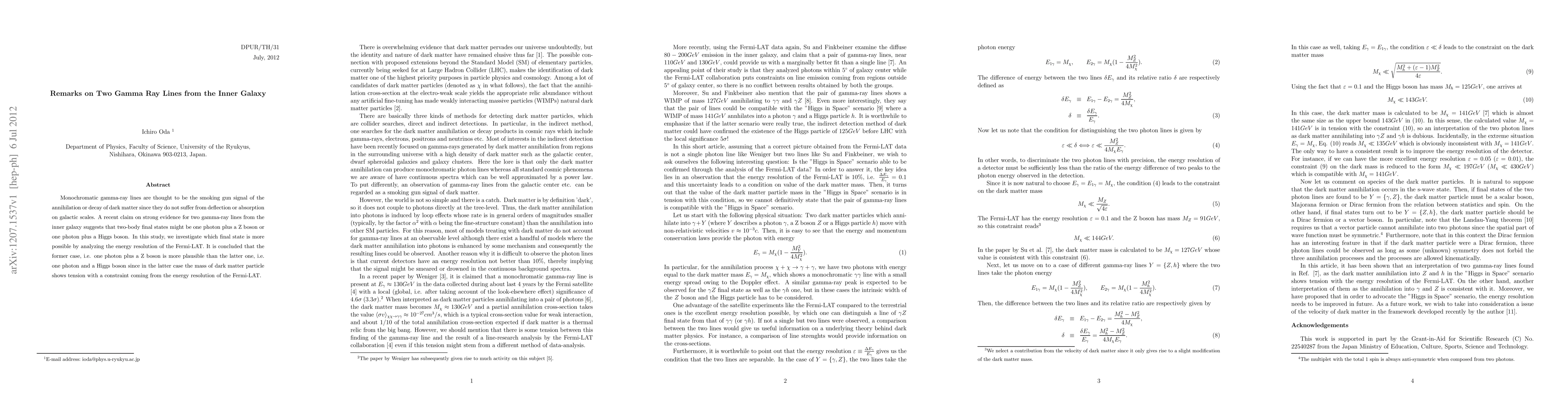 Monochromatic gamma-ray lines are thought to be the smoking gun signal of the annihilation or decay of dark matter since they do not suffer from deflection or absorption on galactic scales. A recent claim on strong evidence for two gamma-ray lines from the inner galaxy suggests that two-body final states might be one photon plus a Z boson or one photon plus a Higgs boson. In this study, we investigate which final state is more possible by analyzing the energy resolution of the Fermi-LAT. It is concluded that the former case, i.e. one photon plus a Z boson is more plausible than the latter one, i.e. one photon and a Higgs boson since in the latter case the mass of dark matter particle shows tension with a constraint coming from the energy resolution of the Fermi-LAT.