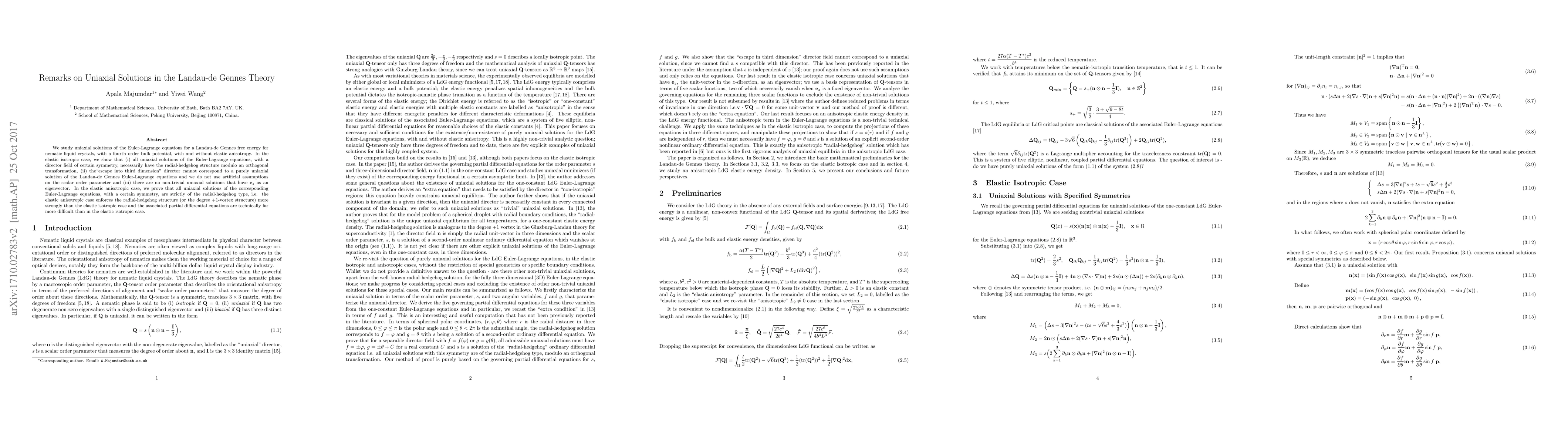 This paper investigates uniaxial solutions in the Landau-de Gennes theory for nematic liquid crystals, showing that in isotropic elasticity, all such solutions exhibit radial-hedgehog structure without third-dimensional "escape" and exclude $\mathbf{e}_z$ as an eigenvector. In anisotropic elasticity, uniaxial solutions are strictly radial-hedgehog, enforcing this structure more strongly than in the isotropic case.