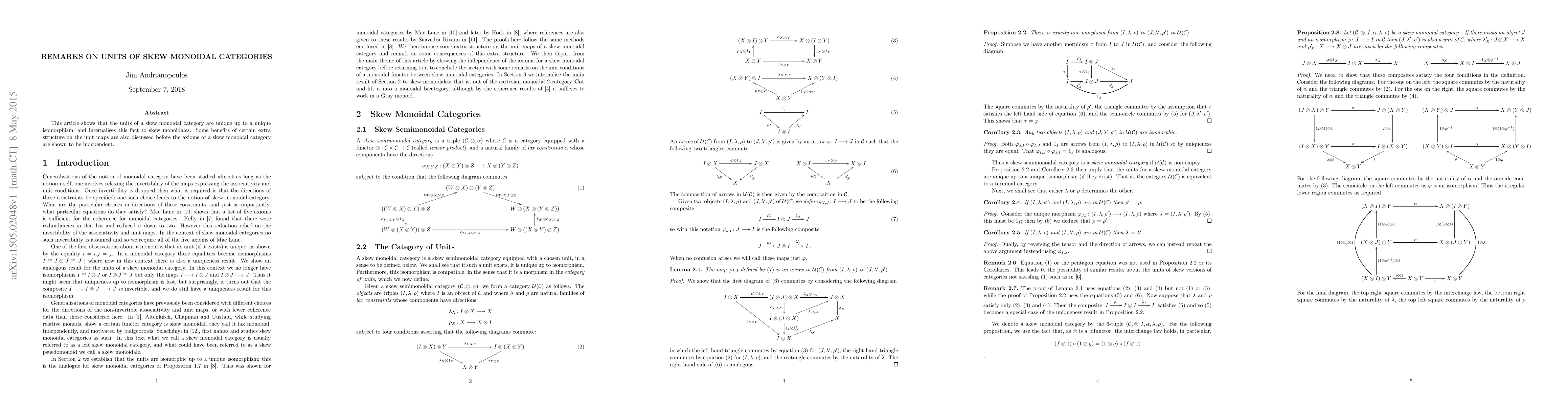 Summary: The paper establishes the uniqueness of units in skew monoidal categories up to a unique isomorphism and explores additional structural benefits on unit maps, concluding with an analysis of the independence of skew monoidal category axioms.