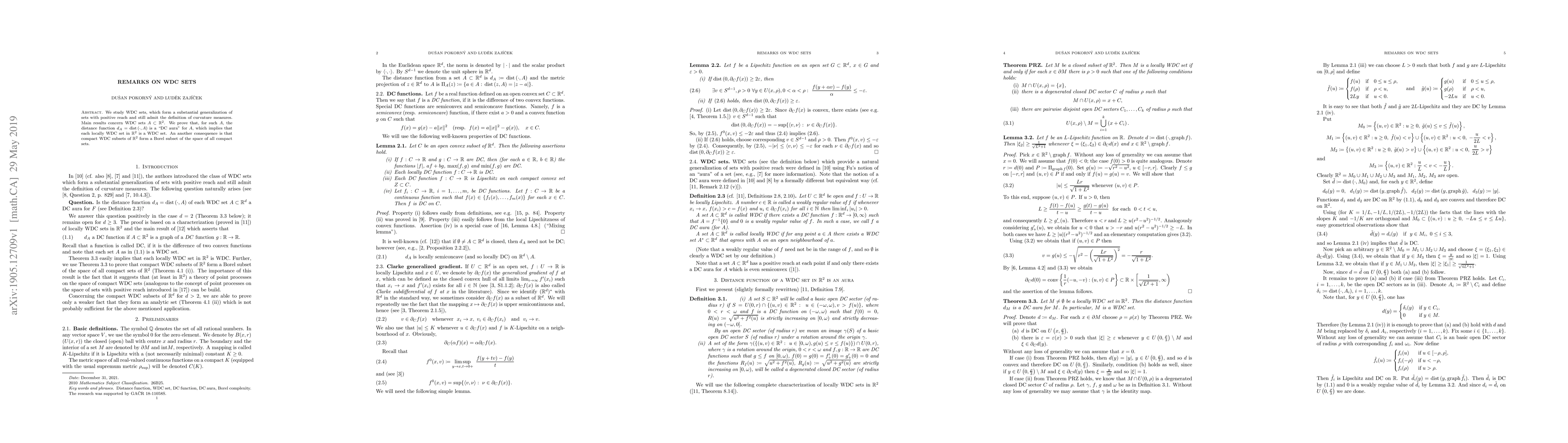 This paper explores WDC sets, a generalization of sets with positive reach, and proves that the distance function for such sets is a "DC aura," implying that locally WDC sets in $\mathbb{R}^2$ are WDC sets. Additionally, it shows that compact WDC subsets of $\mathbb{R}^2$ form a Borel subset in the space of all compact sets.