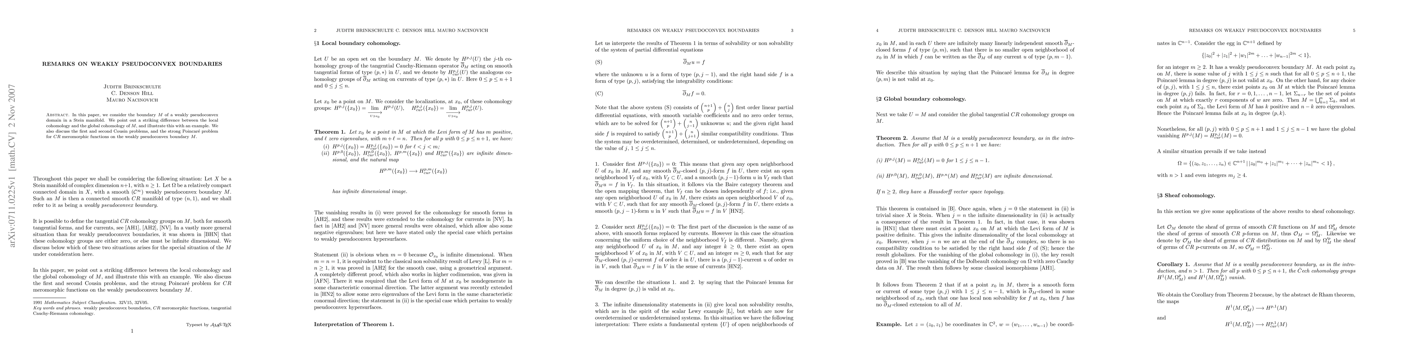 In this paper, we consider the boundary M of a weakly pseudoconvex domain in a Stein manifold. We point out a striking difference between the local cohomology and the global cohomology of M, and illustrate this with an example. We also discuss the first and second Cousin problems, and the strong Poincare problem for CR meromorphic functions on the weakly pseudoconvex boundary M.