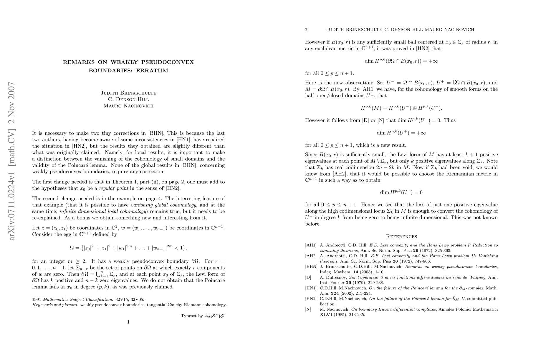 The paper corrects inconsistencies in previous work [HN1] by Brinkschulte, Hill, and Nacinovich (BHN) regarding weakly pseudoconvex boundaries, referencing [HN2] for accurate results. It also presents a new observation on the infinite-dimensional cohomology of certain domains.