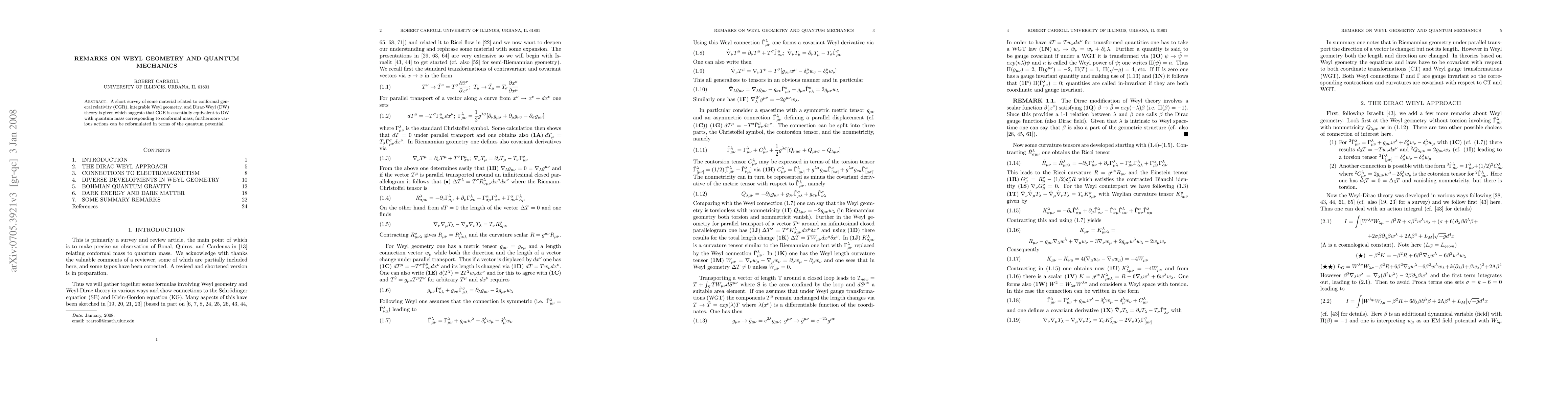 A short survey of some material related to conformal general relativity (CGR), integrable Weyl geometry, and Dirac-Weyl (DW) theory is given which suggests that CGR is essentially equivalent to DW with quantum mass equivalent to conformal mass, and various actions can be reformulated in terms of the quantum potential.