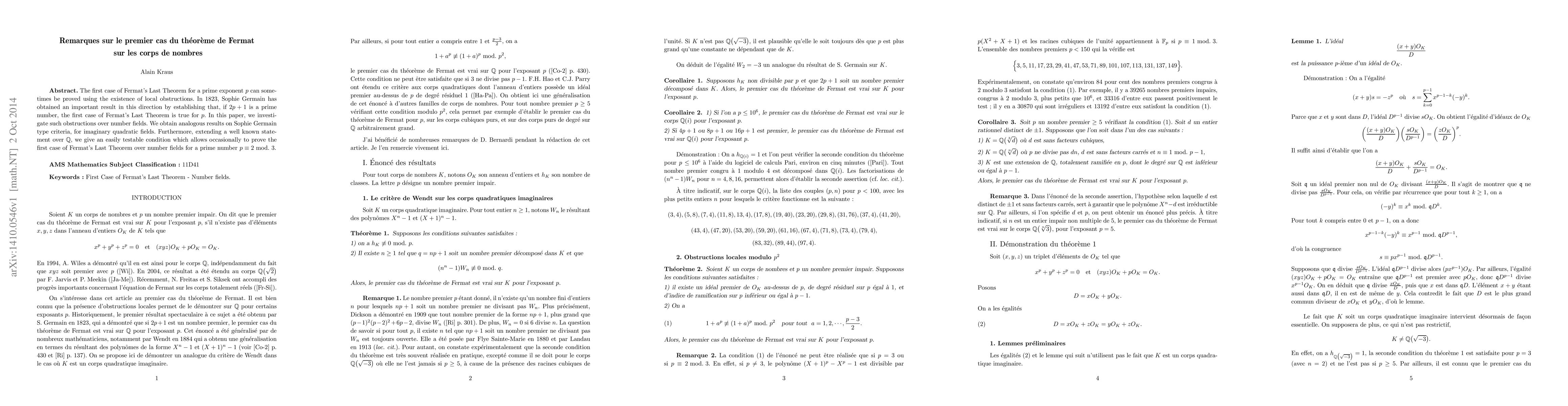 The first case of Fermat's Last Theorem for a prime exponent $p$ can sometimes be proved using the existence of local obstructions. In 1823, Sophie Germain has obtained an important result in this direction by establishing that, if $2p+1$ is a prime number, the first case of Fermat's Last Theorem is true for $p$. In this paper, we investigate such obstructions over number fields. We obtain analogous results on Sophie Germain type criteria, for imaginary quadratic fields. Furthermore, extending a well known statement over ${\bf Q}$, we give an easily testable condition which allows occasionally to prove the first case of Fermat's Last Theorem over number fields for a prime number $p\equiv 2 \mod 3$.