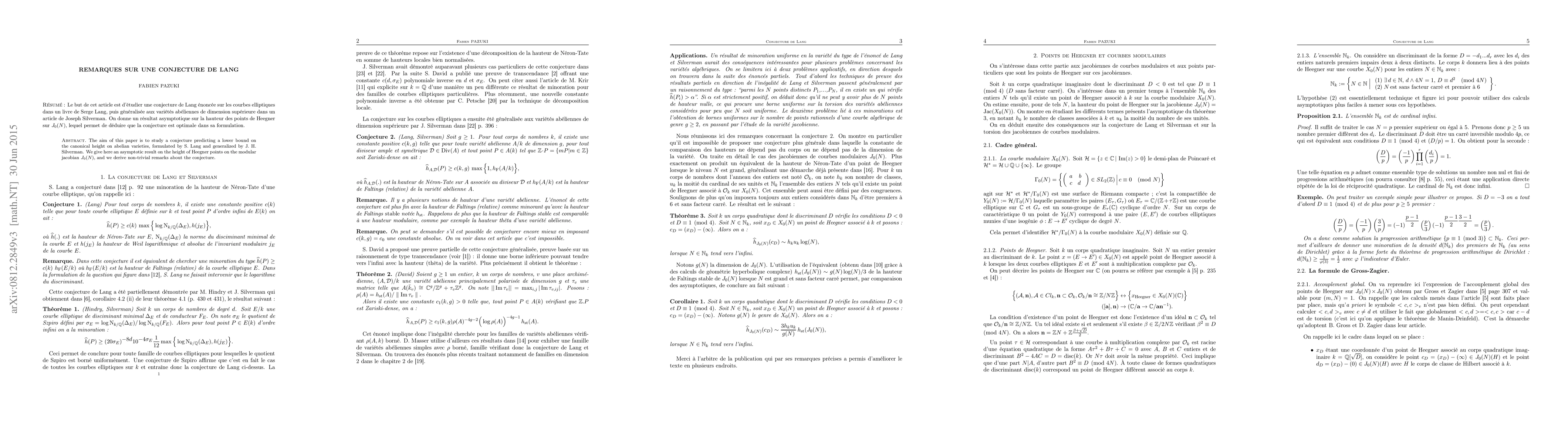 The aim of this paper is to study a conjecture predicting a lower bound on the canonical height on abelian varieties, formulated by S. Lang and generalized by J. H. Silverman. We give here an asymptotic result on the height of Heegner points on the modular jacobian $J_{0}(N)$, and we derive non-trivial remarks about the conjecture.