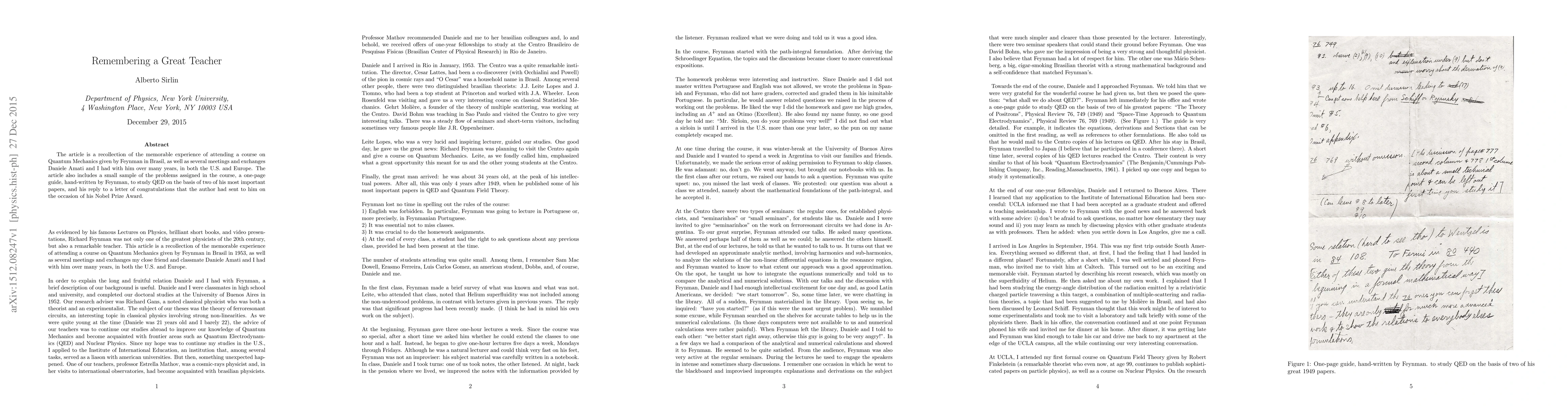 The article is a recollection of the memorable experience of attending a course on Quantum Mechanics given by Feynman in Brasil, as well as several meetings and exchanges Daniele Amati and I had with him over many years, in both the U.S. and Europe. The article also includes a small sample of the problems assigned in the course, a one-page guide, hand-written by Feynman, to study QED on the basis of two of his most important papers, and his reply to a letter of congratulations that the author had sent to him on the occasion of his Nobel Prize Award.