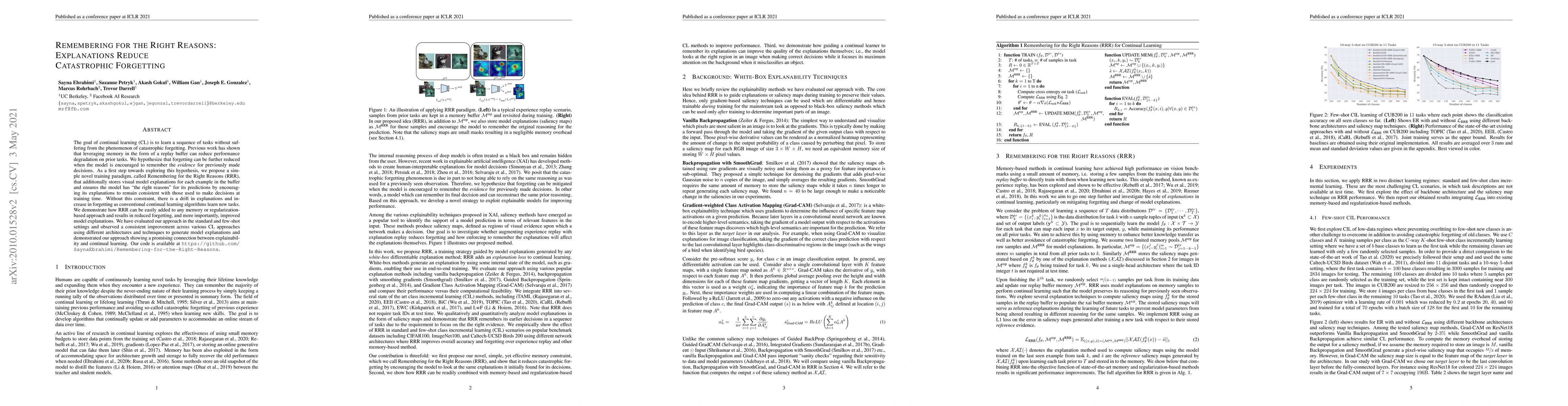 This paper proposes a new training paradigm called Remembering for the Right Reasons (RRR) to mitigate catastrophic forgetting in continual learning by storing visual model explanations and ensuring consistency in explanations over time. The approach consistently improves performance across various continual learning methods and enhances model explainability.