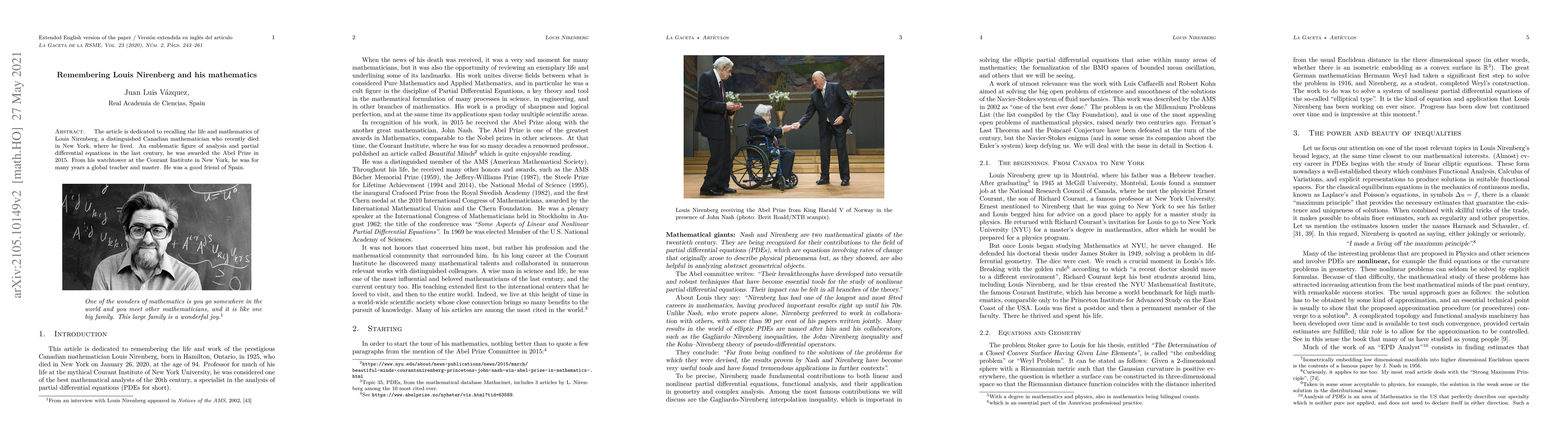 The article is dedicated to recalling the life and mathematics of Louis Nirenberg, a distinguished Canadian mathematician who recently died in New York, where he lived. An emblematic figure of Analysis and Partial Differential Equations in the last century, he was awarded the Abel Prize in 2015. From his watchtower at the Courant Institute in New York, he was for many years a global teacher and master. He was a good friend of Spain.