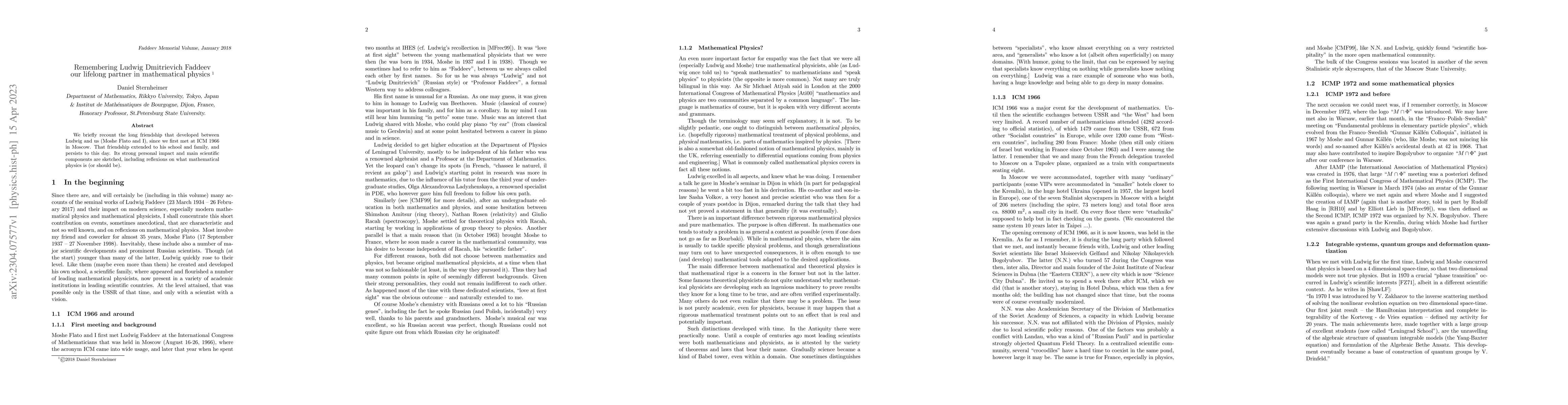 Title: Remembering Ludwig Dmitrievich Faddeev, our lifelong partner in mathematical physics Summary: This paper reflects on the enduring friendship between Ludwig Faddeev and the authors, highlighting their shared scientific journey and personal bond since their first meeting at ICM 1966, and discussing the essence of mathematical physics.