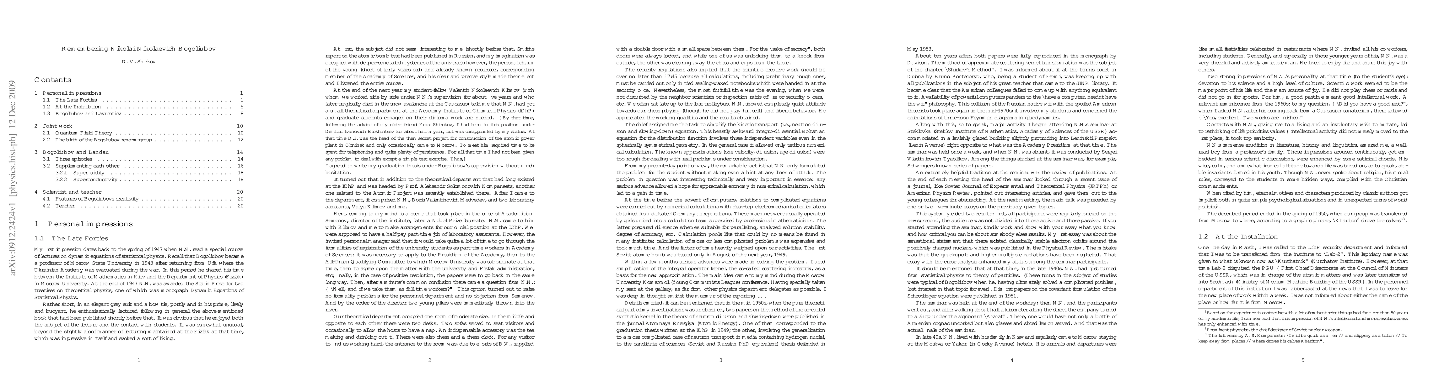 The recollection of souvenirs on great theoretical physicist, addressed to wide physical audience on the occasion of Bogoliubov centenary. Contains four parts: 1. Personal impressions; 2. Joint work; 3. Bogoliubov cp. Landau and 4. Scientist and Teacher.