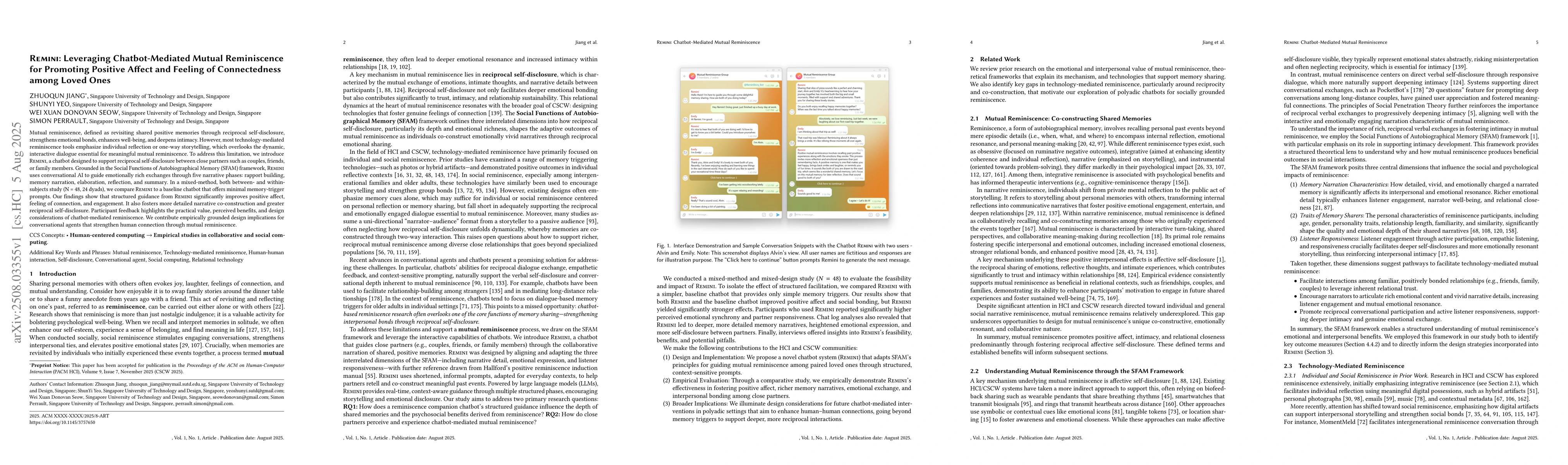 Mutual reminiscence, defined as revisiting shared positive memories through reciprocal self-disclosure, strengthens emotional bonds, enhances well-being, and deepens intimacy. However, most technology-mediated reminiscence tools emphasize individual reflection or one-way storytelling, which overlooks the dynamic, interactive dialogue essential for meaningful mutual reminiscence. To address this limitation, we introduce Remini, a chatbot designed to support reciprocal self-disclosure between close partners such as couples, friends, or family members. Grounded in the Social Functions of Autobiographical Memory (SFAM) framework, Remini uses conversational AI to guide emotionally rich exchanges through five narrative phases: rapport building, memory narration, elaboration, reflection, and summary. In a mixed-method, both between- and within- subjects study (N = 48, 24 dyads), we compare Remini to a baseline chatbot that offers minimal memory-trigger prompts. Our findings show that structured guidance from Remini significantly improves positive affect, feeling of connection, and engagement. It also fosters more detailed narrative co-construction and greater reciprocal self-disclosure. Participant feedback highlights the practical value, perceived benefits, and design considerations of chatbot-mediated reminiscence. We contribute empirically grounded design implications for conversational agents that strengthen human connection through mutual reminiscence.