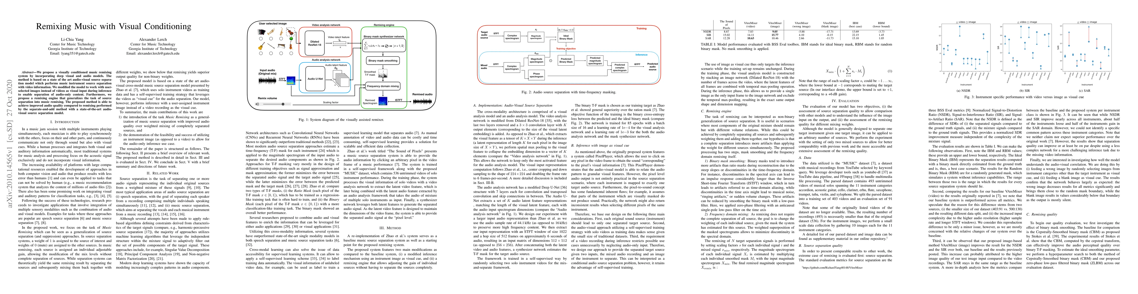 This paper introduces a visually conditioned music remixing system using deep visual and audio models, leveraging an advanced audio-visual source separation technique to separate music instruments with image input. The remixing engine enhances audio quality over traditional methods, achieving better results than separate-and-add approaches.