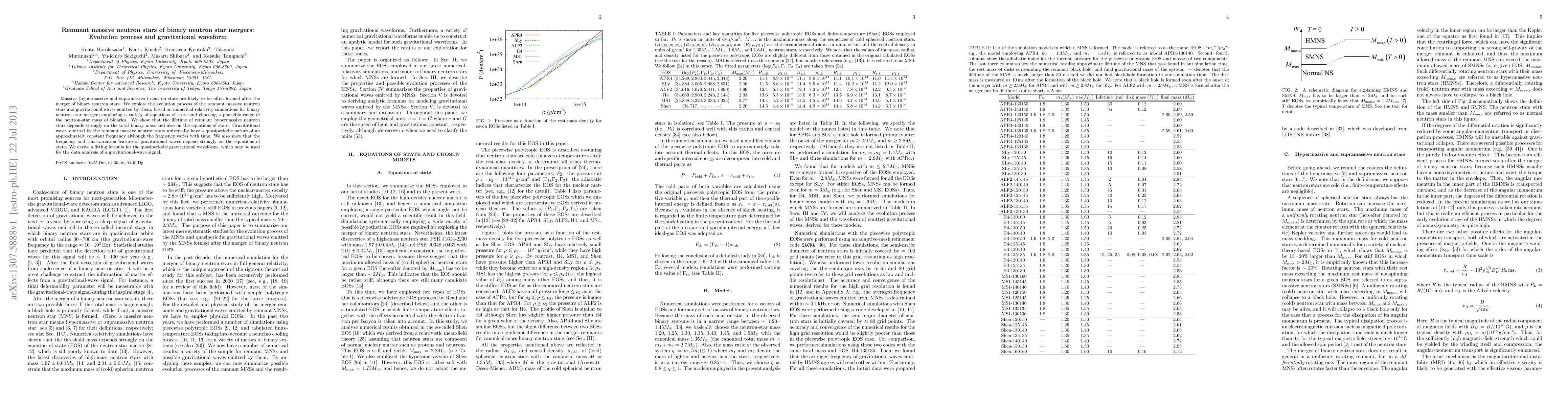 This paper investigates the evolution and gravitational waveforms of massive neutron stars formed after binary neutron star mergers, using numerical simulations. It finds that the lifetime of hypermassive neutron stars is influenced by the total binary mass and the equations of state, and that gravitational waves emitted exhibit quasiperiodic behavior dependent on these factors, with a fitting formula provided for data analysis.