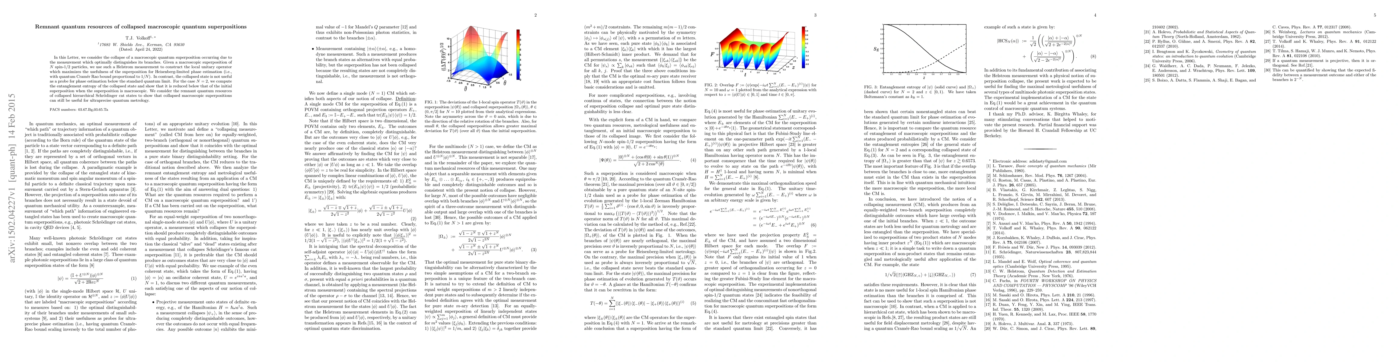 This paper investigates the quantum resources remaining in macroscopic quantum superpositions after measurement collapse, demonstrating that while collapsed states are not useful for phase estimation below the standard quantum limit, they retain potential for ultraprecise quantum metrology. For N=2, it shows reduced entanglement entropy in the collapsed state compared to the initial superposition.