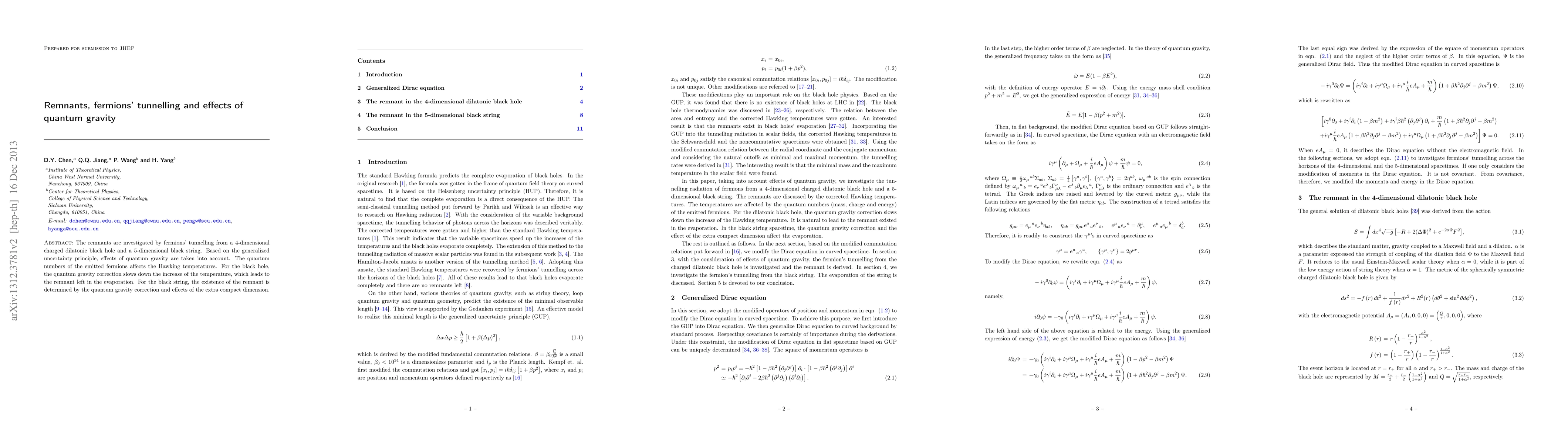 The remnants are investigated by fermions' tunnelling from a 4-dimensional charged dilatonic black hole and a 5-dimensional black string. Based on the generalized uncertainty principle, effects of quantum gravity are taken into account. The quantum numbers of the emitted fermions affects the Hawking temperatures. For the black hole, the quantum gravity correction slows down the increase of the temperature, which leads to the remnant left in the evaporation. For the black string, the existence of the remnant is determined by the quantum gravity correction and effects of the extra compact dimension.