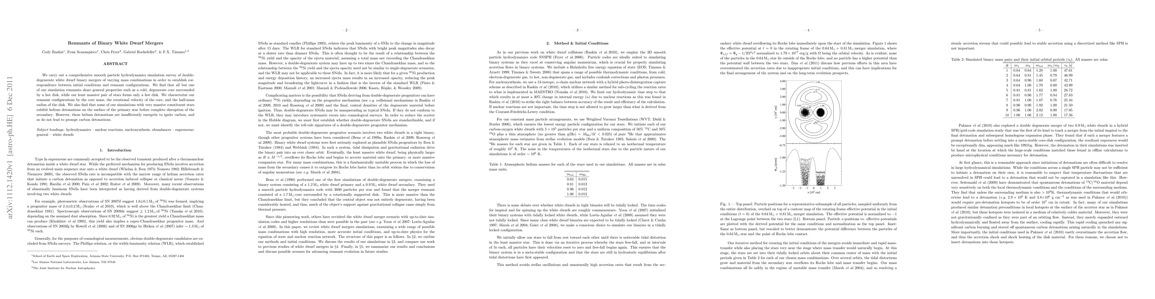 This study uses smooth particle hydrodynamics simulations to explore the outcomes of binary white dwarf mergers, finding that most remnants feature a cold, dense core with a surrounding hot disk, except for the least massive merger which only forms a hot disk. Additionally, very massive mergers can trigger helium detonations without leading to carbon detonations.