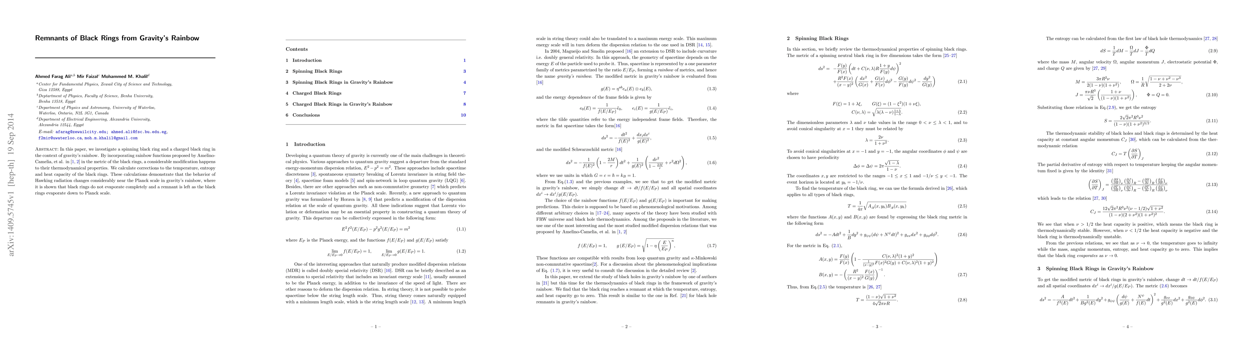 This paper explores spinning and charged black rings within the framework of gravity's rainbow, showing that incorporating rainbow functions alters their thermodynamic properties. The study finds that black rings leave remnants as they evaporate near the Planck scale, deviating from complete evaporation.