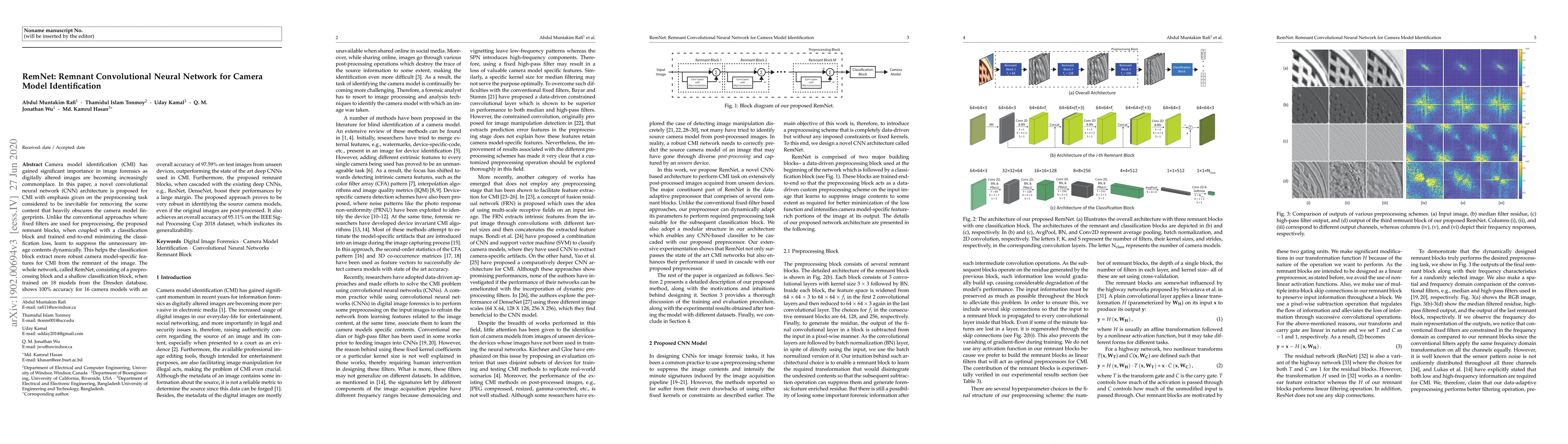 RemNet, a novel convolutional neural network architecture, dynamically removes scene content to identify camera models with high accuracy, achieving 100% accuracy for 16 out of 18 models on the Dresden database and 97.59% on unseen devices. It also significantly enhances the performance of existing deep CNNs like ResNet and DenseNet.