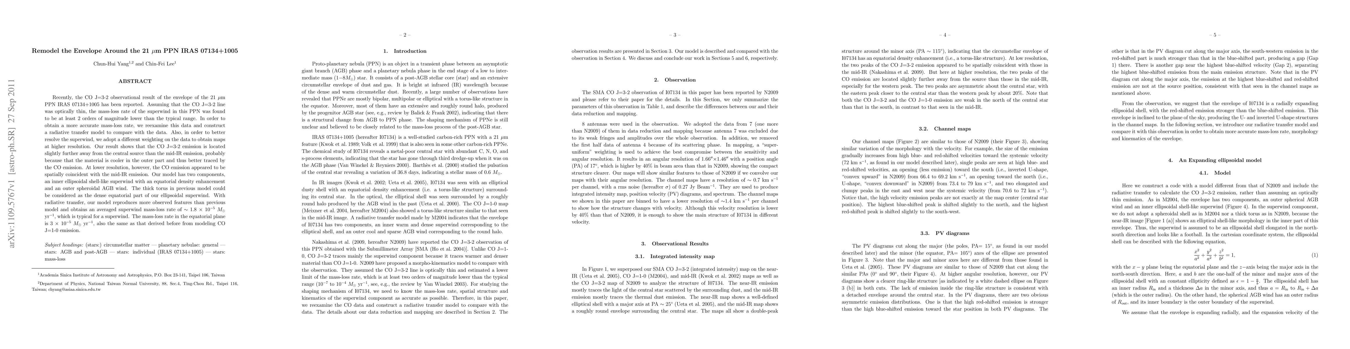Recently, the CO J=3-2 observational result of the envelope of the 21 micrometer PPN IRAS 07134+1005 has been reported. Assuming that the CO J=3-2 line was optically thin, the mass-loss rate of the superwind in this PPN was found to be at least 2 orders of magnitude lower than the typical range. In order to obtain a more accurate mass-loss rate, we reexamine this data and construct a radiative transfer model to compare with the data. Also, in order to better resolve the superwind, we adopt a different weighting on the data to obtain maps at higher resolution. Our result shows that the CO J=3-2 emission is located slightly further away from the central source than the mid-IR emission, probably because that the material is cooler in the outer part and thus better traced by the CO emission. At lower resolution, however, the CO emission appeared to be spatially coincident with the mid-IR emission. Our model has two components, an inner ellipsoidal shell-like superwind with an equatorial density enhancement and an outer spheroidal AGB wind. The thick torus in previous model could be considered as the dense equatorial part of our ellipsoidal superwind. With radiative transfer, our model reproduces more observed features than previous model and obtains an averaged superwind mass-loss rate of ~ 1.8 x 10^-5 solar mass per year, which is typical for a superwind. The mass-loss rate in the equatorial plane is 3 x 10^-5 solar mass per year, also the same as that derived before from modeling CO J=1-0 emission.