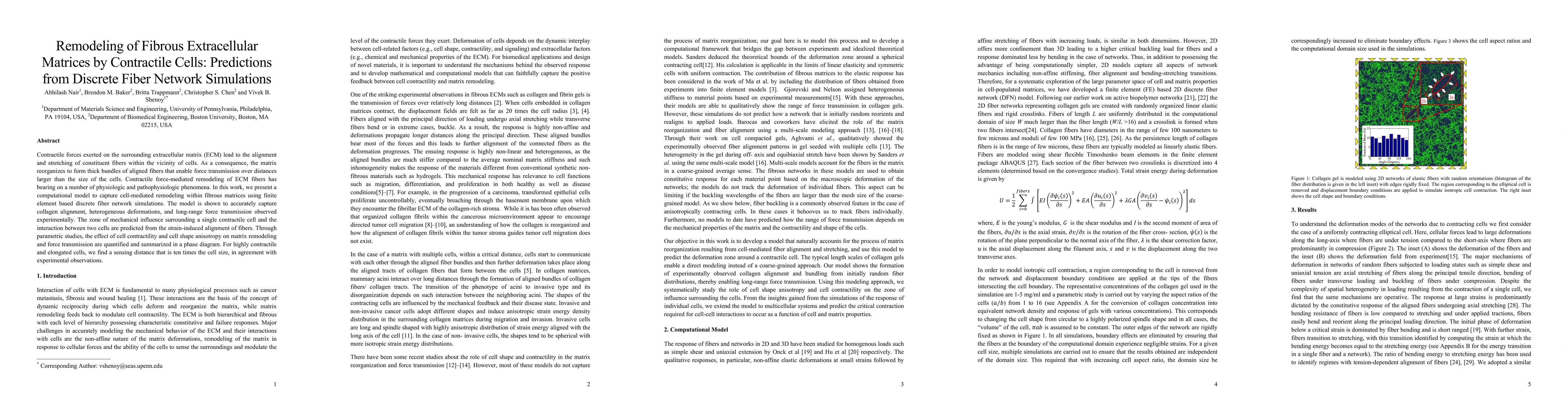 This paper presents a computational model using discrete fiber network simulations to predict how contractile cells remodel fibrous extracellular matrices, capturing collagen alignment, deformations, and force transmission. The study quantifies the effects of cell contractility and shape on matrix remodeling, revealing a sensing distance ten times the cell size for highly contractile, elongated cells.