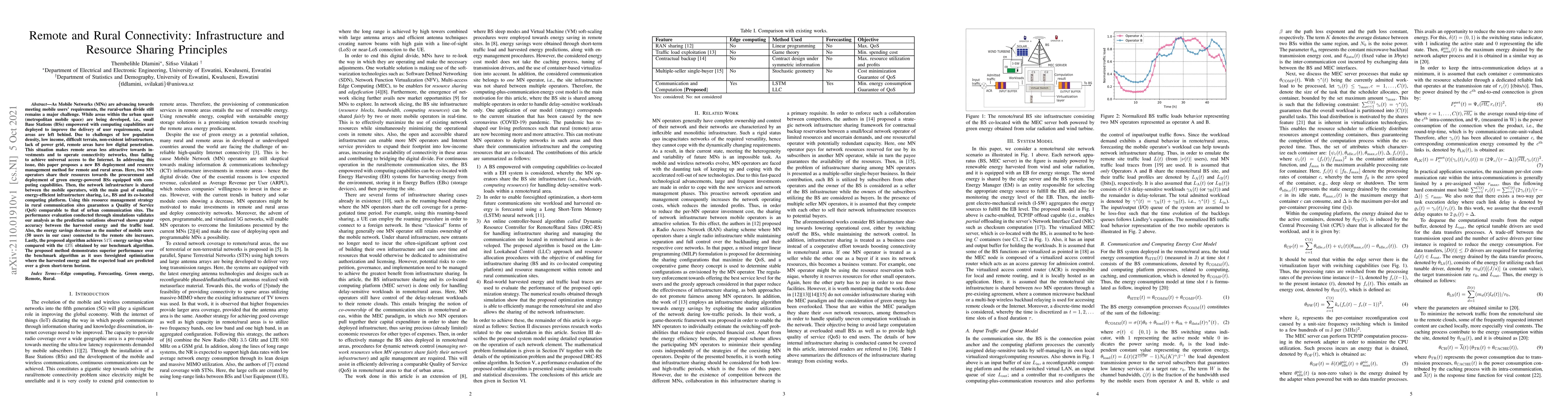 As Mobile Networks (MNs) are advancing towards meeting mobile users requirements, the rural-urban divide still remains a major challenge. While areas within the urban space (metropolitan mobile space) are being developed, rural areas are left behind. Due to challenges of low population density, low income, difficult terrain, non-existent infrastructure, lack of power grid, remote areas have low digital penetration. This situation makes remote areas less attractive towards investments and to operate connectivity networks, thus failing to achieve universal access to the Internet. In addressing this issue, this paper proposes a new BS deployment and resource management method for remote and rural areas. Here, two MN operators share their resources towards the procurement and deployment of green energy-powered BSs equipped with computing capabilities. Then, the network infrastructure is shared between the mobile operators, with the main goal of enabling energy-efficient infrastructure sharing, i.e., BS and its co-located computing platform. Using this resource management strategy in rural communication sites guarantees a Quality of Service (QoS) comparable to that of urban communication sites. The performance evaluation conducted through simulations validates our analysis as the prediction variations observed shows greater accuracy between the harvested energy and the traffic load. Also, the energy savings decrease as the number of mobile users (50 users in our case) connected to the remote site increases. Lastly, the proposed algorithm achieves 51% energy savings when compared with the 43% obtained by our benchmark algorithm. The proposed method demonstrates superior performance over the benchmark algorithm as it uses foresighted optimization where the harvested energy and the expected load are predicted over a given short-term horizon.