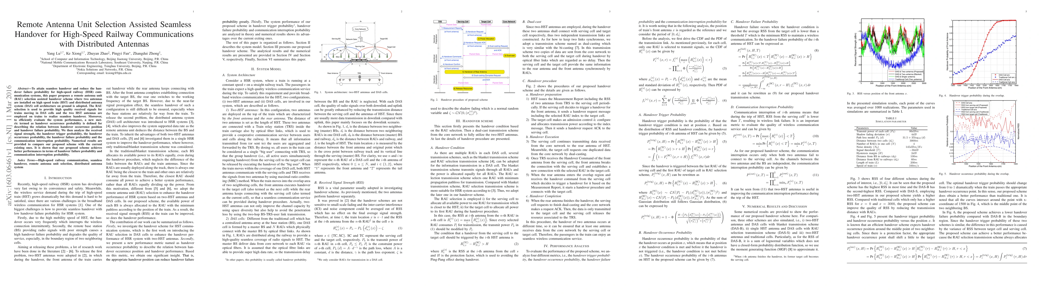 This paper proposes a remote antenna unit (RAU) selection assisted handover scheme for high-speed railway communications to ensure seamless handovers and reduce failure probabilities. The scheme employs two antennas on trains and a distributed antenna system on the ground, defining a new metric for handover performance evaluation and demonstrating improved handover and communication interruption probabilities compared to existing methods.
