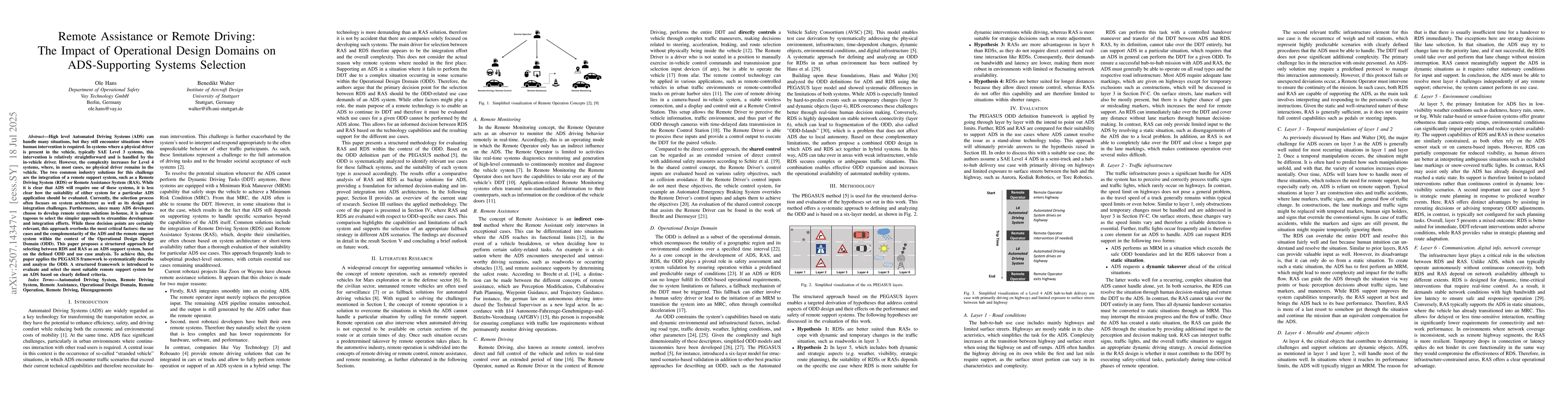 High level Automated Driving Systems (ADS) can handle many situations, but they still encounter situations where human intervention is required. In systems where a physical driver is present in the vehicle, typically SAE Level 3 systems, this intervention is relatively straightforward and is handled by the in-vehicle driver. However, the complexity increases for Level 4 systems, where, in most cases, no physical driver remains in the vehicle. The two common industry solutions for this challenge are the integration of a remote support system, such as a Remote Driving System (RDS) or Remote Assistance System (RAS). While it is clear that ADS will require one of these systems, it is less clear how the suitability of either system for a particular ADS application should be evaluated. Currently, the selection process often focuses on system architecture as well as its design and integration challenges. Furthermore, since many ADS developers choose to develop remote system solutions in-house, it is advantageous to select the simpler approach to streamline development and integration efforts. While these decision points are certainly relevant, this approach overlooks the most critical factors: the use cases and the complementarity of the ADS and the remote support system within the context of the Operational Design Design Domain (ODD). This paper proposes a structured approach for selecting between RDS and RAS as an ADS support system, based on the defined ODD and use case analysis. To achieve this, the paper applies the PEGASUS framework to systematically describe and analyze the ODD. A structured framework is introduced to evaluate and select the most suitable remote support system for an ADS based on clearly defined criteria.