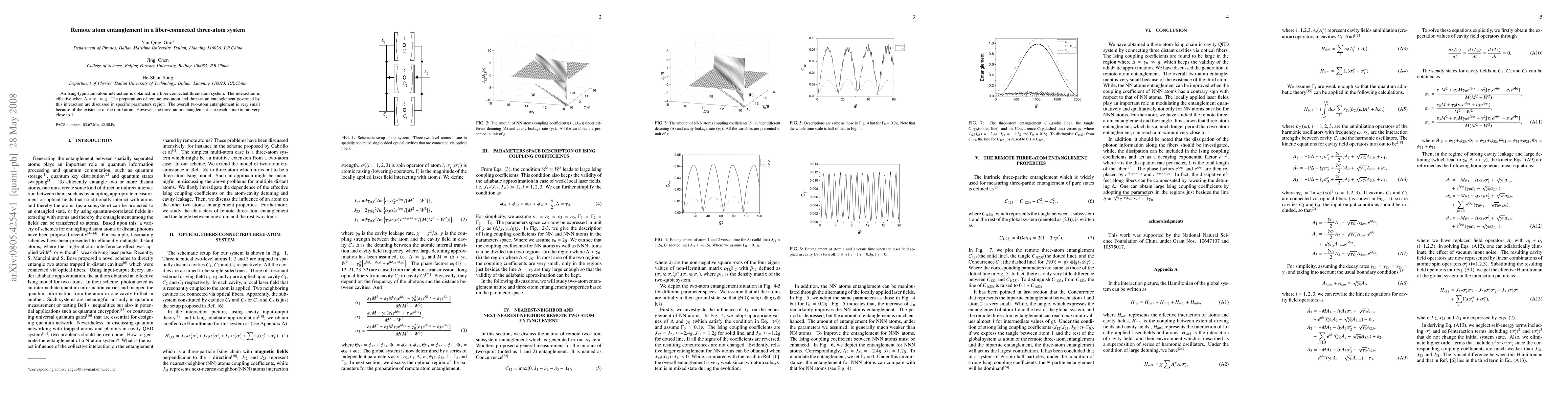This paper explores remote atom entanglement in a fiber-connected three-atom system using an Ising-type interaction, finding significant three-atom entanglement when $\Delta\approx \gamma_{0}\gg g$, while the two-atom entanglement remains minimal due to the third atom's influence.