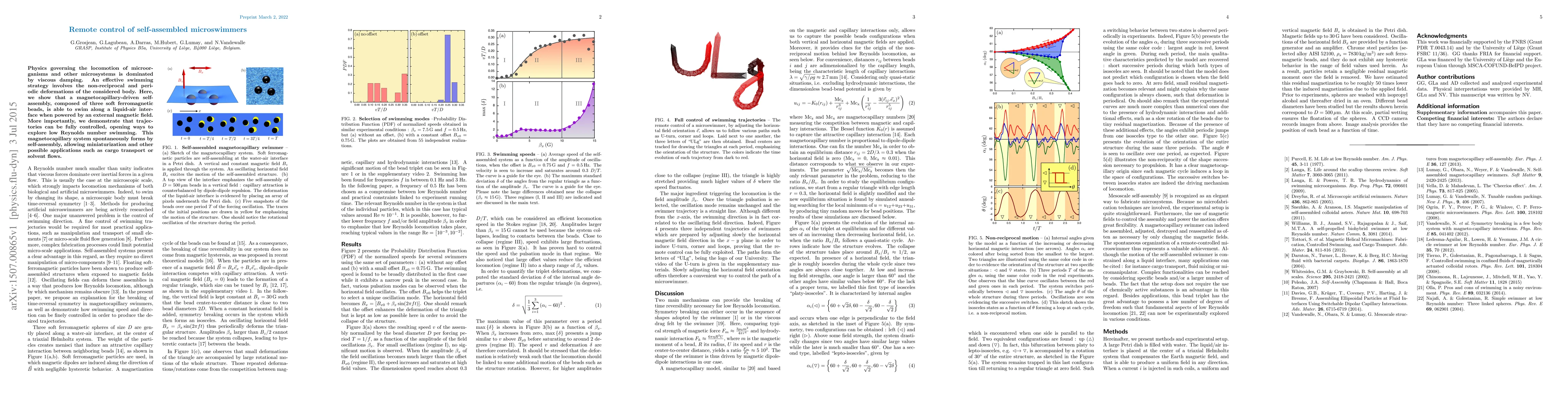 Physics governing the locomotion of microorganisms and other microsystems is dominated by viscous damping. An effective swimming strategy involves the non-reciprocal and periodic deformations of the considered body. Here, we show that a magnetocapillary-driven self-assembly, composed of three soft ferromagnetic beads, is able to swim along a liquid-air interface when powered by an external magnetic field. More importantly, we demonstrate that trajectories can be fully controlled, opening ways to explore low Reynolds number swimming. This magnetocapillary system spontaneously forms by self-assembly, allowing miniaturization and other possible applications such as cargo transport or solvent flows.