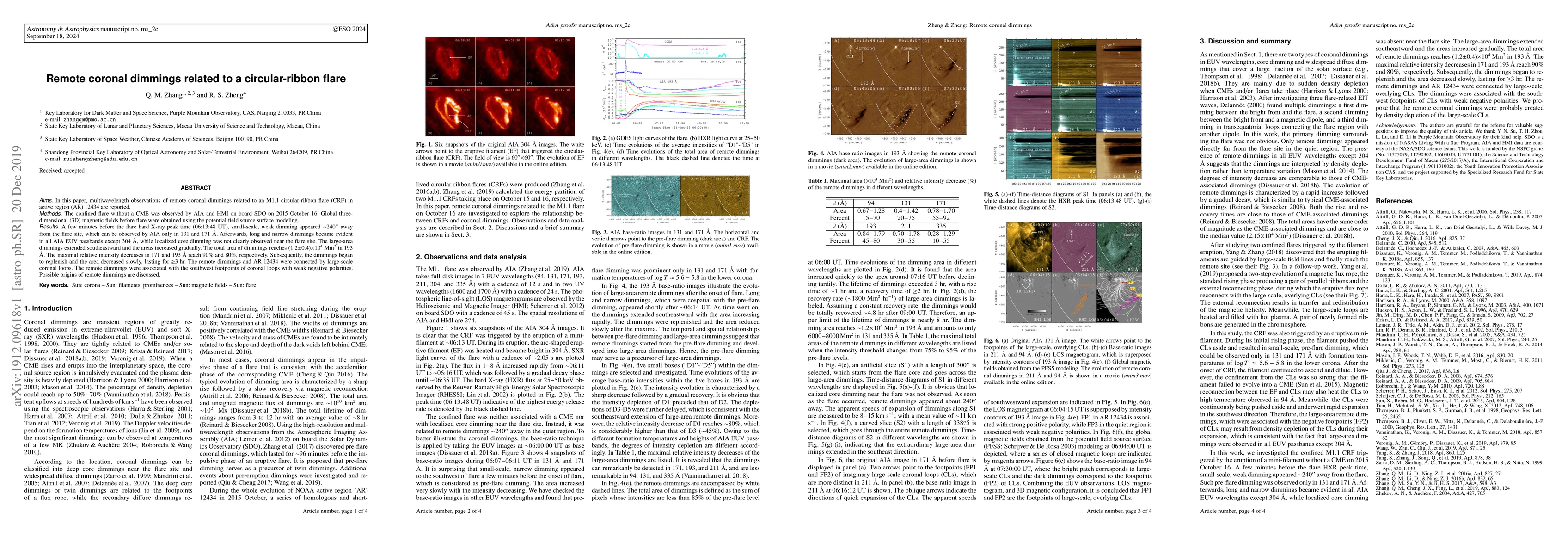 This paper reports multiwavelength observations of remote coronal dimmings linked to an M1.1 circular-ribbon flare in AR 12434, noting significant dimming areas extending southeastward and intensity decreases up to 90%. The dimmings were connected to large-scale coronal loops and were likely caused by magnetic reconnection.