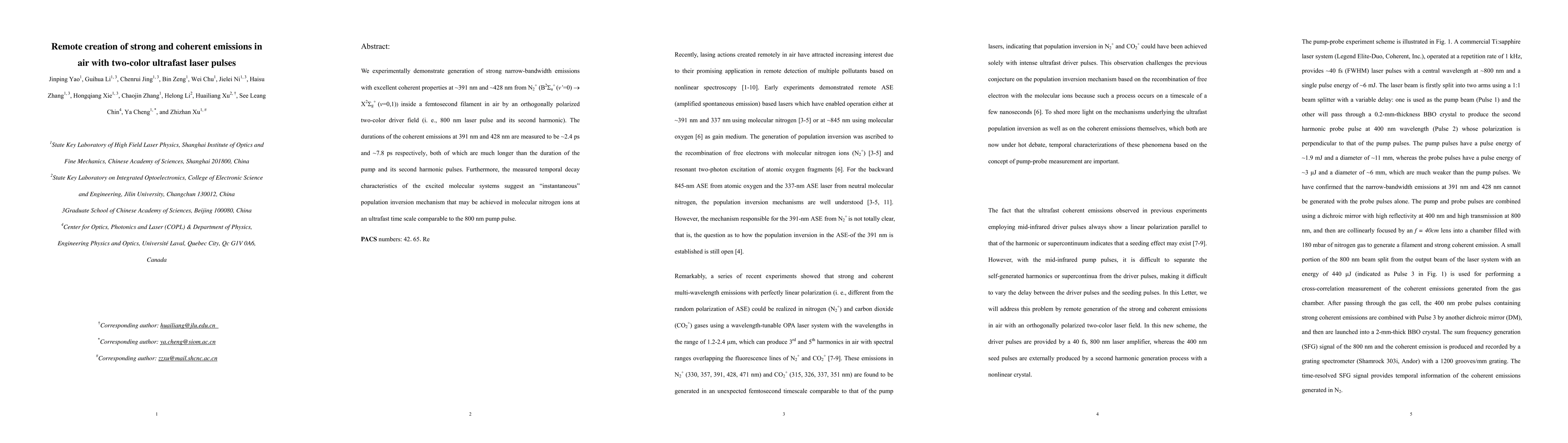 This paper demonstrates the generation of strong, coherent emissions at ~391 nm and ~428 nm from nitrogen molecular ions in air using two-color ultrafast laser pulses, revealing a mechanism of "instantaneous" population inversion on ultrafast time scales. The emissions' durations are significantly longer than the driving pulses, indicating a unique interaction process.