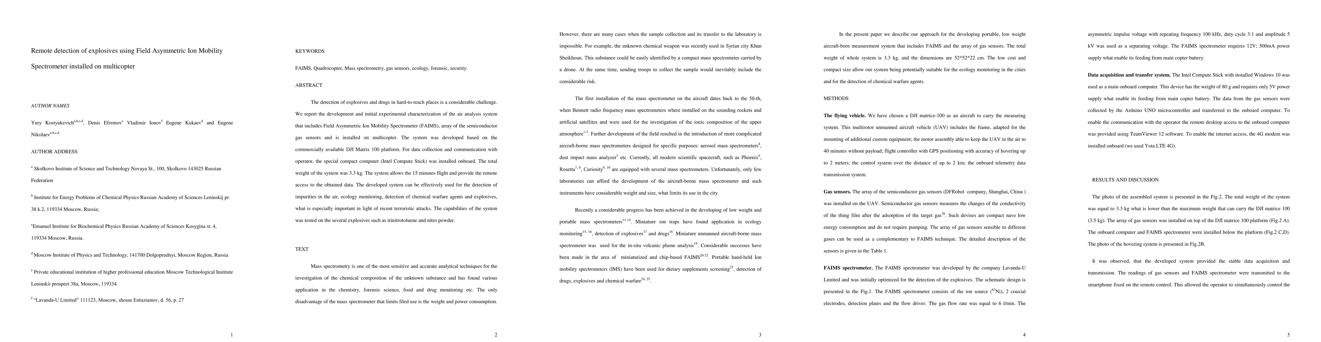 The detection of explosives and drugs in hard-to-reach places is a considerable challenge. We report the development and initial experimental characterization of the air analysis system that includes Field Asymmetric Ion Mobility Spectrometer (FAIMS), array of the semiconductor gas sensors and is installed on multicopter. The system was developed based on the commercially available DJI Matrix 100 platform. For data collection and communication with operator, the special compact computer (Intel Compute Stick) was installed onboard. The total weight of the system was 3.3 kg. The system allows the 15 minutes flight and provide the remote access to the obtained data. The developed system can be effectively used for the detection of impurities in the air, ecology monitoring, detection of chemical warfare agents and explosives, what is especially important in light of recent terroristic attacks. The capabilities of the system was tested on the several explosives such as trinitrotoluene and nitro powder.