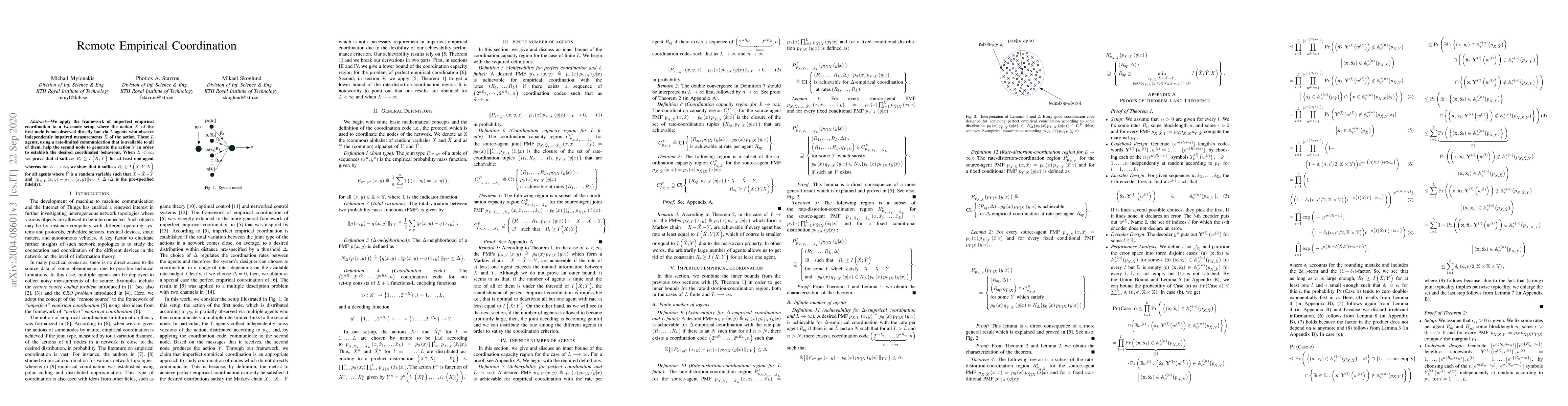 This paper explores imperfect empirical coordination in a two-node system where the first node's action is indirectly observed via $L$ agents. It demonstrates that for finite $L$, at least one agent's communication rate must exceed the mutual information between their measurement and the second node's action to achieve coordination. For large $L$, all agents must meet this condition, ensuring fidelity between true and estimated actions.